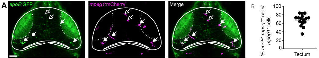 ApoE is expressed in a subset of mpeg1+ tectal cells. (A) Confocal images of the optic tectum of an apoE:GFP;mpeg1:mCherry animal. Filled or empty arrows indicate colocalisation, or lack thereof, between apoE and mpeg1. Scale bar, 50 μm. (B) Quantification of the proportion of apoE+/mpeg1+ cells among all mpeg1+ cells in the tectum. n = 16 animals
