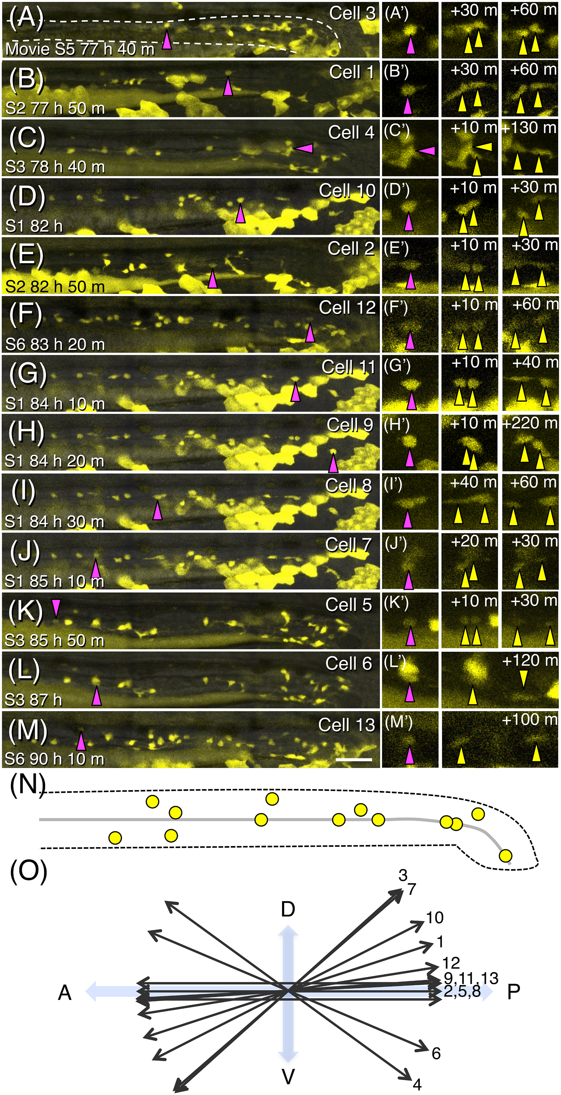 Positions and orientations of neural crest cell divisions in the gut. A‐M, Projection images at the time of division prepared by using time‐lapse movies from five embryos in the posterior midgut and entire hindgut for 12‐29 hr between ca. 3 and 4 dpf. Images are aligned according to the developmental stage shown in the bottom‐left corners. Cell ID numbers are shown in the top‐right corners. The cells about to divide are indicated with magenta triangles, and their close‐up images (A′‐M′) and daughter cells (yellow triangles) at indicated time after division are shown in panels on the right. The white dashed line outlines the gut in (A). Scale bar = 50 μm. N, Schematic drawing of the positions of identified ENCC divisions. A black dashed line outlines the gut, and the grey line represents the position of the lumen. O, Summary of the orientation of each cell division