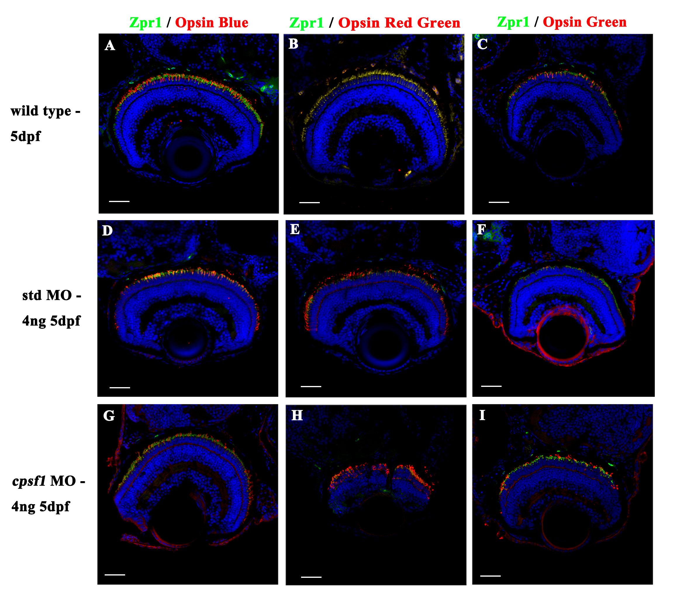 Photoreceptor cells developed normally in wild-type larvae (A-C), std MO larvae (D-F), and cpsf1 morphants (G-I). (A, D, G): Co-labelling with anti-Zpr1 (for double-cone photoreceptor cells, green) and anti-Opsin Blue (for blue cone photoreceptor cells, red) antibodies showed that the blue cone photoreceptor cells were mature. (B, E, H): Co-labelling with anti-Zpr1 (for double-cone photoreceptor cells, green) and anti-Opsin Red/Green (for red/green cone photoreceptor cells, red) antibodies indicated that the red and green cone photoreceptor cells developed normally. (C, F, I): Co-labelling with anti-Zpr1 (for double-cone photoreceptor cells, green) and anti-Opsin Green (for green cone photoreceptor cells, red) antibodies demonstrated that the green cone photoreceptor cells attained maturity.