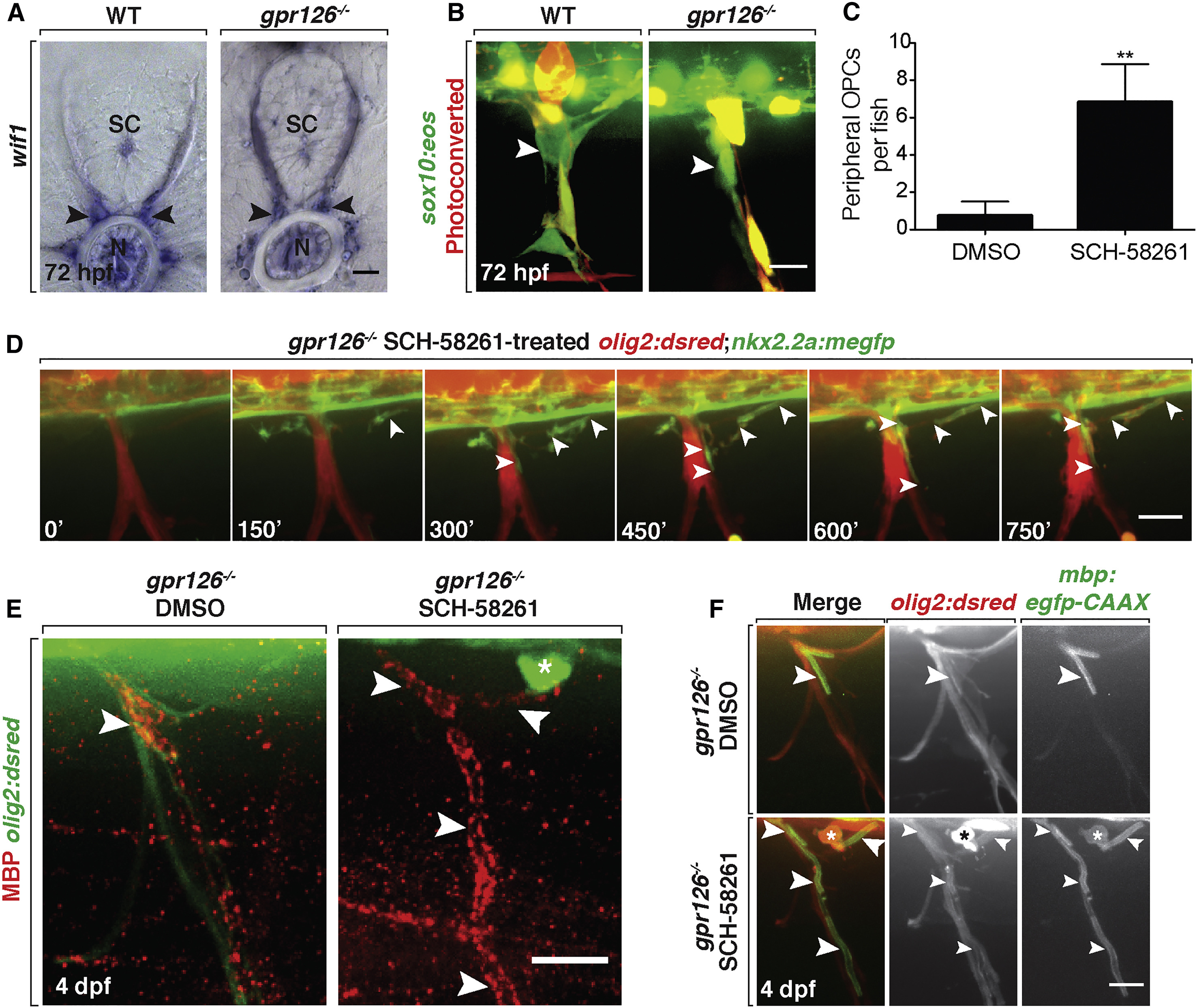 (F) Live images of 4 dpf WT and gpr126−/−;olig2:dsred;mbp:egfp larvae treated with DMSO or SCH-58261 from 36 hpf to 3 dpf. Asterisk marks olig2+ peripheral OPC with mbp+ membrane sheaths (arrowheads) around peripheral motor axons. Scale bars, 20 μm.