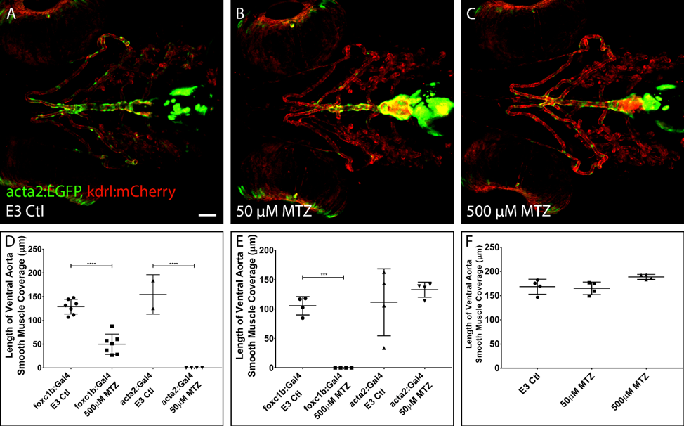 Treatment of Metronidazole (MTZ) does not affect vessel patterning or vSMC coverage along the ventral aorta in embryos. A-C) 4 dpf acta2:EGFP, kdrl:mCherry E3 control embryos lacking the NTR construct (A) show that treatment with MTZ does not affect vascular patterning or development of vSMC when using the same doses for acta2:Gal4 (B) or foxc1b:Gal4 (C) ablation. n = 4 embryos per panel. D) Quantification of vSMC coverage from data in Figure 9 A-D, using live transgenics (foxc1b:Gal4; UAS-NTR:mCherry or acta2:Gal4; UAS-NTR:mCherry) at 4 dpf. E) Quantification of vSMC coverage in Figure 9 E-H, using acta2 mRNA in situ hybridization. F) Quantification of vSMC coverage using live transgenics lacking NTR construct (acta2:EGFP, kdrl:mCherry). Data points in D-F represent individual embryos. *** = p < 0.001, ANOVA with Sidak’s multiple comparisons test. Scale bar represents 50 µm.