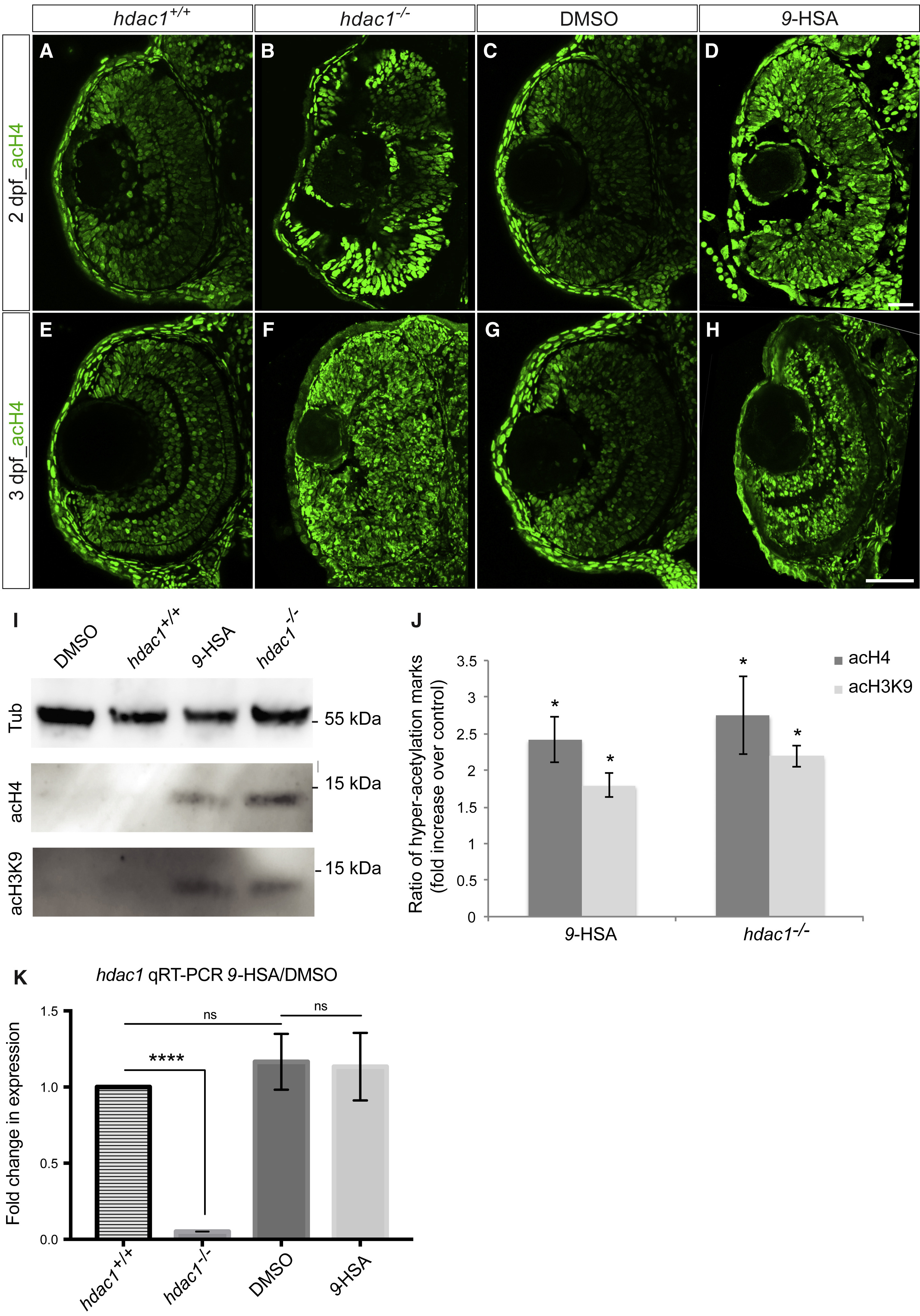 (J) Western blot quantification of hyperacetylation of the histone 4 (acH4) and histone 3 (acH3K9) marks. Data are presented as ratios of 9-HSA-treated over DMSO-treated embryos and hdac1−/− mutant over wild-type (hdac1+/+). Values are means ± standard error of three independent samples.