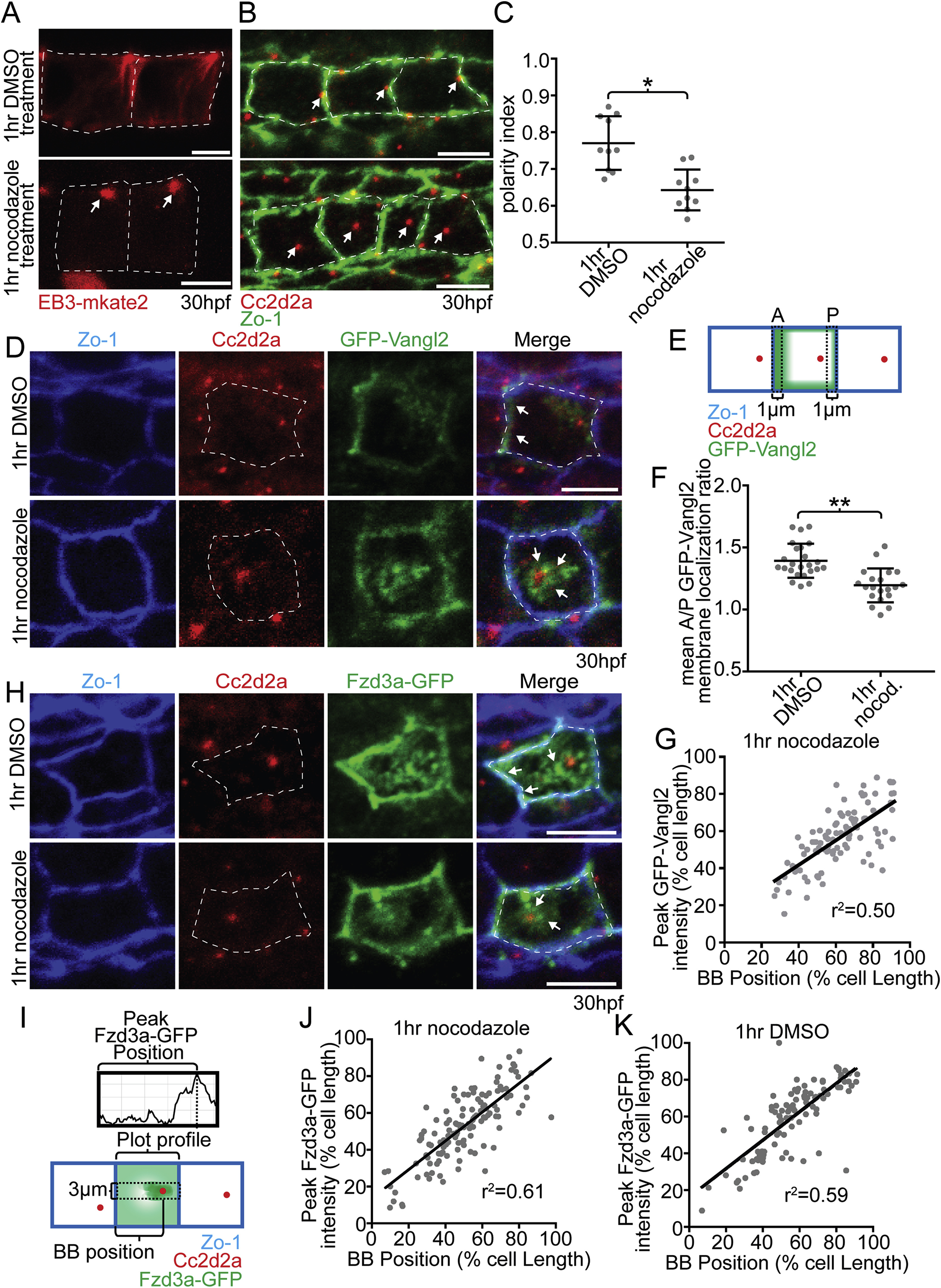 Microtubules are required to maintain floorplate PCP. (A) Live lateral views of floorplate cells expressing Tg(shh:gal4); Tg(uas:EB3-mkate2) at 30 hpf. Upon nocodazole treatment EB3-mkate2 labeled MTs collapse to subapical foci near the BB (arrows). (B) Ventral views of Cc2d2a (red) and Zo-1 (green) immunostaining Arrows indicate position of BBs. Nocodazole treatment disrupts the posterior localization of BBs. (C) Quantitation of per embryo average BB polarity index after 1hr DMSO treatment (control) or 1hr nocodazole treatment. N = 200 cells, 20 embryos; *p = 0.0003; significance was determined with Mann-Whitney test. (D) Ventral views of 30hpf Tg(shh:gal4); Tg(uas:GFP-Vangl2) embryos. White dotted lines indicate cell boundaries based on ZO-1 staining. Arrows indicate GFP-Vangl2 localization at the anterior membrane in controls and around the BB in nocodazole-treated embryos. (E) Diagram illustrating how anterior and posterior membrane levels of GFP-Vangl2 were measured in fixed ventral floorplate images. (F) Quantitation of per embryo average GFP-Vangl2 anterior vs. posterior membrane localization ratios in isolated floorplate cells expressing Tg(shh:gal4); Tg(uas:GFP-Vangl2). N = 416 cells, 66 embryos; **p < 0.0001, *p = 0.0013; significance was determined with a Kruskal-Wallis test with Dunn's multiple comparison. (G) Graph of the correlation between GFP-Vangl2 and BB localization. After 1hr nocodazole treatment peak GFP-Vangl2 intensity correlates with the position of the BB N = 10 embryos, 100 cells, r2 = 0.50. (H) Ventral views of floorplate cells at 30 hpf immunostained for Fzd3a-GFP (green), Zo-1 (blue) and Cc2d2a (red) after 1hr DMSO treatment (control) or 1hr nocodazole treatment. (I) Diagram illustrating how peak Fzd3a-GFP localization and BB positions were measured. BB distance from anterior membrane was measured compared to overall anterior-posterior cell length. A 3 μm wide ROI centered on the position of the BB was drawn from anterior to posterior membranes. The “plot profile” tool in ImageJ was used to measure average GFP levels across the anterior to posterior cell axis. (J,K) Correlation between Fzd3a-GFP localization and BB position in nocodazole-treated and control floorplate cells. Each data point represents the measurements from a single cell. J: N = 100 cells, 10 embryos; r2 = 0.61; K: N = 100 cells, 10 embryos; r2 = 0.59. Scale bars: 5 μm.