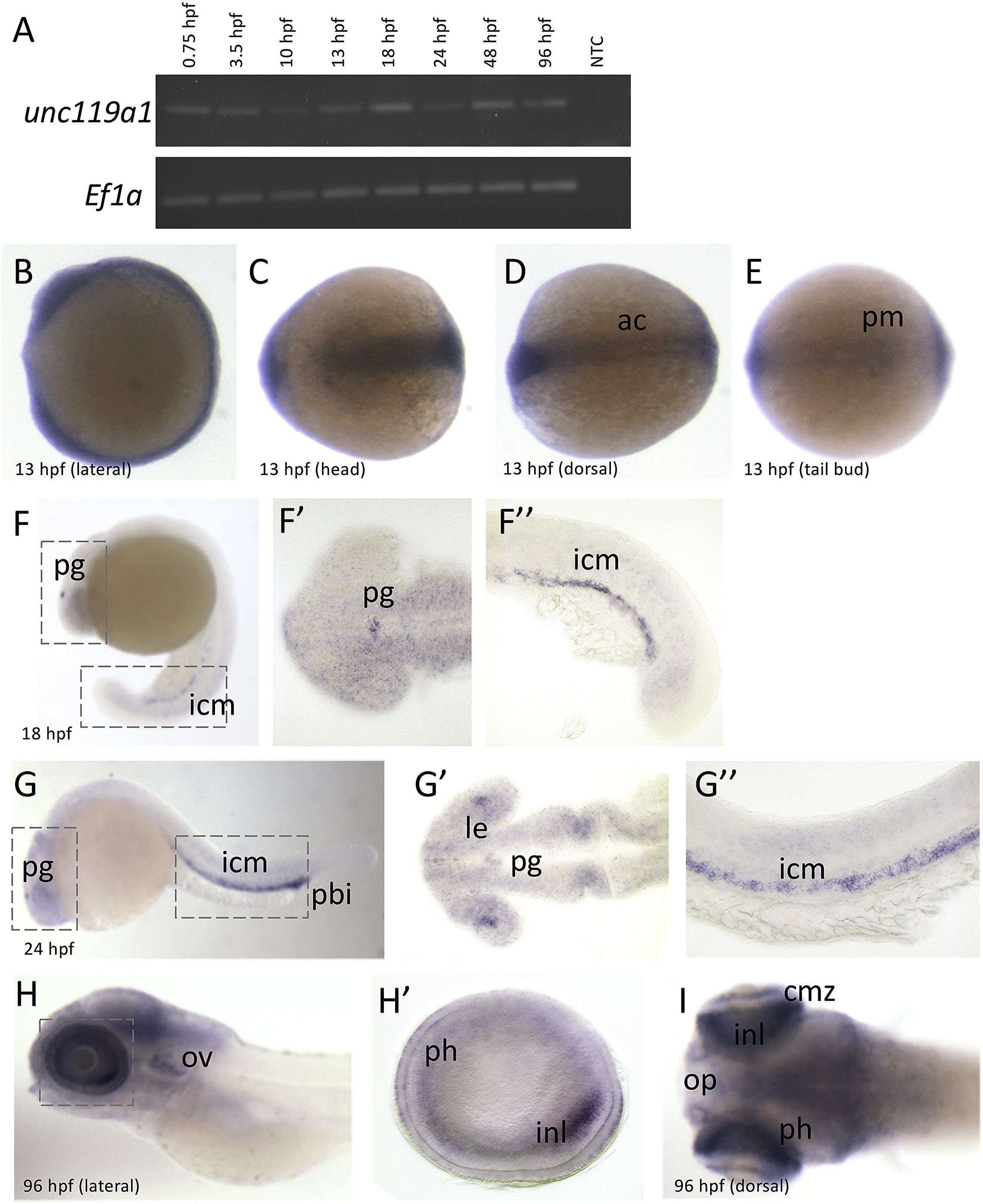 Temporal and spatial expression of zebrafish unc119a1. A. RT-PCR of unc119a at various embryonic time-points (0.75 hpf (2-cell), 3.5 hpf, 10 hpf, 13 hpf, 18 hpf, 24 hpf, 48 hpf, and 96 hpf) compared to Ef1a. B-E. 13 hpf WISH embryos. F. 18 hpf WISH. Boxed regions are represented in flatmounts of the head (F′) and tail (F″). G. 24 hpf WISH. Boxed regions are represented in flatmounts of the head (G′) and tail (G″). H. Lateral view of 96 hpf WISH. Boxed region is represented in eye flatmount (H′). I. Dorsal view of 96 hpf WISH. Abbreviations: cmz, ciliary marginal zone; icm, intermediate cell mass; inl, inner nuclear layer; le, lens; NTC, non-template control; op, olfactory pits; ov, otic vesicle; pbi, posterior blood island; pg, pineal gland; ph, photoreceptors; pm, posterior mesenchyme.