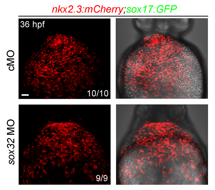 mCherry fluorescence in the pericardium of Tg(nkx2.3:mCherry;sox17:GFP) embryos injected ng cMO or ng sox32 MO at 36 hpf. Ventral views, anterior to the top. Scale bar, 50 μm.