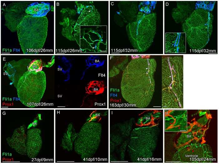 Figure 1 Whole-mount confocal imaging of non-cleared (A-D, F-I) and cleared (E,J) adult (A-F) and juvenile (G-J) transgenic zebrafish hearts expressing the pan-endothelial marker fli1a:GFP (Green), venous/lymphatic endothelial marker flt4:mCitrine (blue: A-F) and lymphatic endothelial marker prox1:Gal4-UAS:RFP (red: E-J). (A) Through juvenile and young adult stages, flt4:mCitrine-expressing endothelial cells are restricted to the surface of the BA. (B) At 26 mm standard body length, sprouts from this BA population are first observed on the ventricle surface (arrowhead and insert). (C) These sprouts then extend down the ventricle and start to form a cardiac lymphatic vessel that eventually extends the entire length of the ventricle to the apex (D). The cardiac lymphatic vessel (D, inset, blue arrowhead) bridges the blood vessel (D, inset, green arrowhead) it accompanies. (E) Distinct from the venous endothelium of the SV, the BA population and the sprouts extending from it also express prox1:Gal4-UAS:RFP. (F) Both flt4:mCitrine and prox1:Gal4-UAS:RFP are maintained in the formed cardiac lymphatic vessel (arrowhead). (G) Larval and early juvenile zebrafish lack the prox1:Gal4-UAS:RFP expressing lymphatic endothelium on the BA. (H) This population is observed in juvenile zebrafish prior to the onset of and during (I) coronary vessel development. (J) In early adult stages, alignment of single cell sprouts off the lymphatic endothelium (red arrowhead) with blood vasculature (green arrowhead) is observed within the cleft between the BA and ventricle. Scale bars 200 μm (A-J) and 50 μm (insets, B, D, F), n ≥ 3 (A-J).