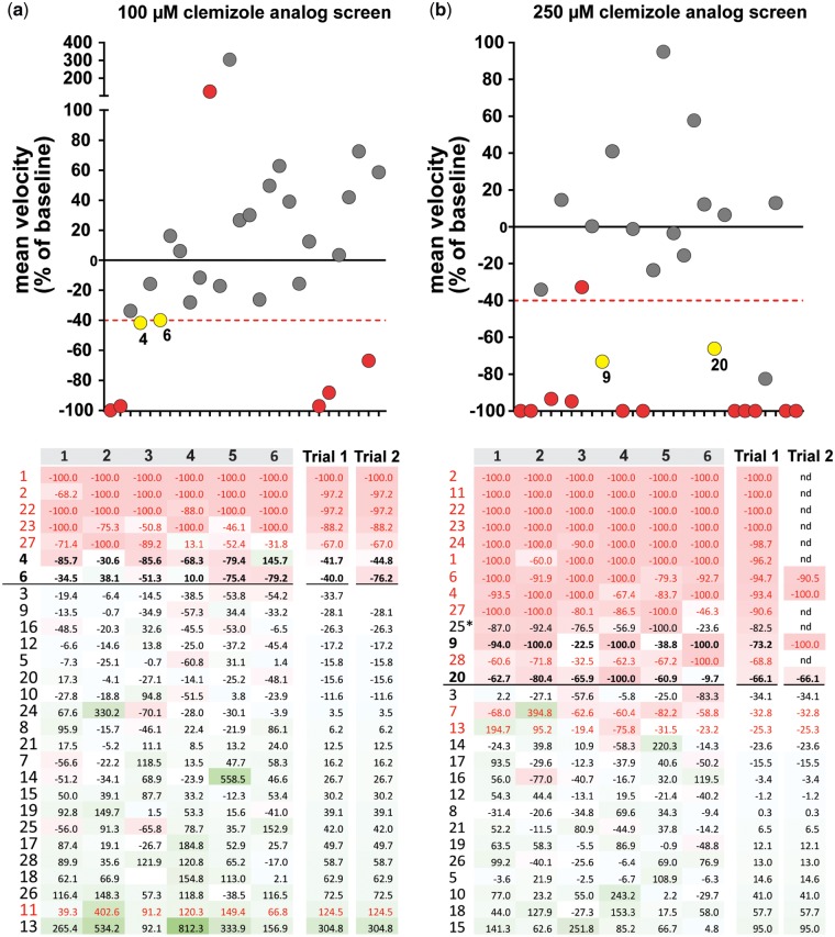 Phenotypic screening of clemizole analogues. Twenty-eight clemizole analogues were screened for efficacy in suppressing the high-velocity seizure-like swim behaviour observed in scn1lab mutant zebrafish. Plots show the change in mean swim velocity of 5 dpf larvae screened at (a) 100 µM, or (b) 250 µM. Threshold for inhibition of seizure activity (positive hits—yellow data points) was determined as a reduction in mean swim velocity of ≥40% (red dashed line). The red data points represent compounds that were classified as toxic after 90-min exposure. The heat map shows the % change in velocity for the six individual larva from the first trial (1–6). Mean velocity change from six individual fish is shown for trial 1 and 2. Clemizole analogue 25 (*) failed to go into solution at 250 µM so it was not considered for further testing.
