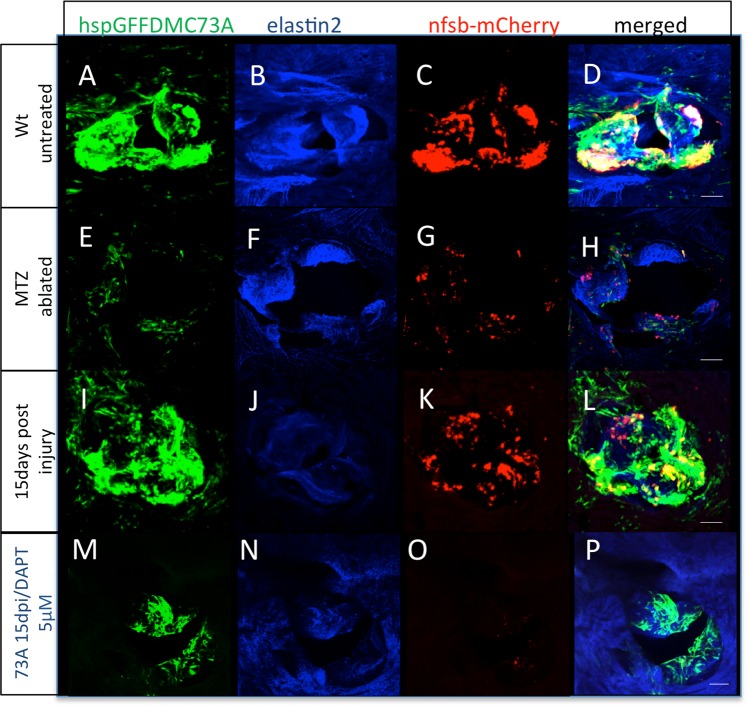 Zebrafish adult valves retain the ability to regenerate through Notch signaling reactivation. (A–D) Z-stack projection of a wt untreated adult valve of an hspGFFDMC73A/UAS-E1b:NfsB-mCherry transgenic fish stained with elastin2. (E–H) Valvular damage of an adult heart of a hspGFFDMC73A/UAS-E1b:NfsB-mCherry transgenic immediately after completion of the MTZ treatment (n = 10). (I–L) Regenerating valve 15 days post chemogenetic valve cell ablation (n = 13). (M–P) Inhibition of regeneration process in the heart of an adult heart of a hspGFFDMC73A/UAS-E1b:NfsB-mCherry transgenic after MTZ treatment and 15 day treatment with DAPT (n = 12). Scale bars: 50 micron.