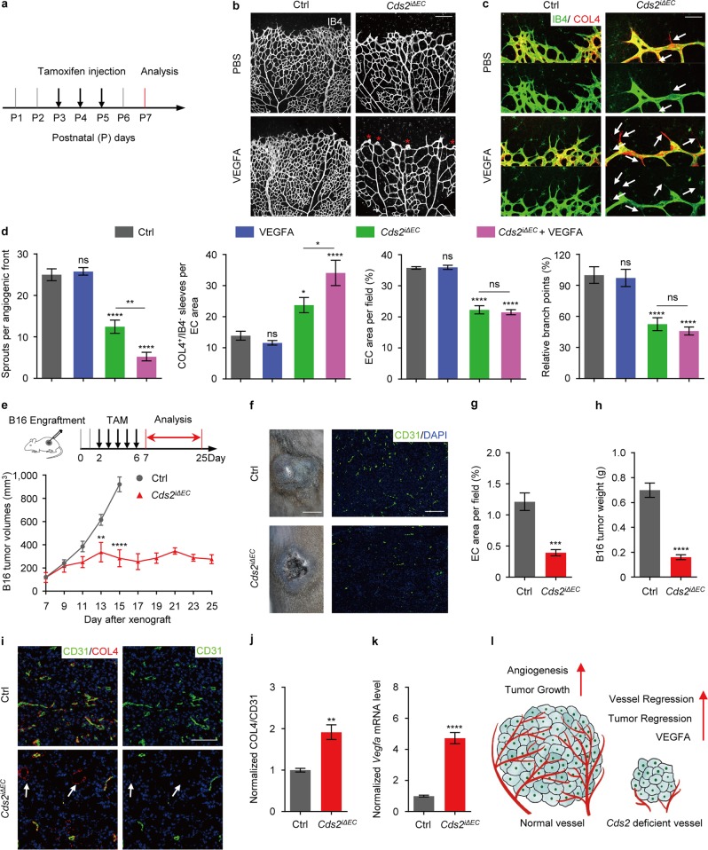 Vessel regression in CDS2 endothelium-specific knockout mice. a Model of tamoxifen treatment on mouse pups. Confocal images of isolectin B4 (IB4) (b) and IB4/Collagen IV (COL4) (c) double stained retinal vessels at postnatal day (P) 7 in Cds2iΔEC or control mice with or w/o VEGFA injection. Asterisks display the blunt angiogenic front. Arrows indicate COL4+/IB4− empty sleeves. d Bar graphs showing analysis of angiogenic sprouts, COL4+/IB4− empty sleeves, endothelial area and vascular branch points. n = 6–10 mice per group. Inactivation of Cds2 caused retardation of B16 tumor growth (e), necrosis (f; left panels, day11 tumors), blood vessel (f; right panels and g) and tumor weight (h) reduction. Schematic diagram (e) shows the strategy to inactivate Cds2 after tumor cell implantation. n = 6–8 tumors from 6–8 mice per group. Anti-COL4 and anti-CD31 co-immunostaining (i) and quantitative analysis (j) on B16 tumors from control or Cds2iΔEC mice at 13 days post-implantation. Arrows indicate regressed vessels. n = 6 tumors from 6 mice as a group. k Quantification of Vegfa mRNA level in day 9 B16 tumors. n = 8 tumors from 4 mice per group. l Model of VEGFA dose-dependent tumor vessel regression in CDS2-deficient endothelium. Left panel shows that increased angiogenesis associates with increased tumor growth in WT mice. Right panel depicts that vessel regression occurs in CDS2-deficient vessels, associated with high level of VEGFA produced by tumor, which in turn further advances vessel regression and blocks tumor progression. Scale bars, 200 μm (b and f; right panel), 70 μm (c), 0.5 cm (f; left panel) and 100 μm (i). Error bars, mean ± SEM. Statistical significance between the indicated sample versus control or between the marked pairs are *P < 0.05, **P < 0.01, ***P < 0.001, ****P < 0.0001, or ns, not significant (P ≥ 0.05). See also Supplementary information, Figs. S2–S5