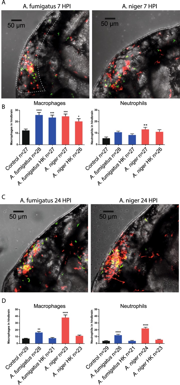 Quantification of leukocyte migration to the hindbrain at early and later stages of infection. (A,C) Representative confocal stacks of Tg (mpeg1:mCherry; mpx:GFP) zebrafish embryos with macrophages and neutrophils labelled in red and green respectively, injected with 150 conidia of A. fumigatus and A. niger at 7 HPI (A) and 24 HPI. (C) Stacks formed the basis of quantification of leukocyte migration to the hindbrain. As Macrophages and conidia were labelled with the same fluorophore, intensity of signal and morphology was used to distinguish conidia from macrophages. (B,D) Quantification of leukocyte migration in the hindbrain of embryos injected with A. fumigatus or A. niger, live or heat-killed (HK) conidia, compared to control injections (2% PVP/PBS) at 7 HPI (B) and 24 HPI. (D) *p ≤ 0,05; **p ≤ 0,01; ***p ≤ 0,001; ****p ≤ 0,0001 by one-way ANOVA with Dunnett’s multiple comparisons test, n = 21–30 per group from 3 biological replications. The quantifications represent a part of a larger data-set which is presented in full in Supplemental Fig. 1. The statistical analysis presented is based on the full dataset.