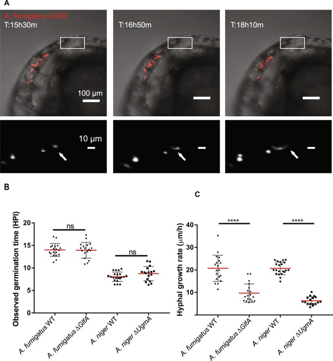 Timelapse microscopy based in vivo analysis of germination and growth rate phenotypes in galctofuranose deficient Aspergillus mutant strains. (A) Example of time-lapse microscopic assessment of hyphal growth-rate after injection of 150 conidia of the A. fumigatus ∆glfA mutant, in a pu.1 morphant embryo. Upper panels show bright field images overlaid with the red fluorescent channel. The lower panel shows a blow-up of a specific area, marked in the upper panels, from the red fluorescent channel with signal in white. Individual confocal stacks of parallel time lapse acquisitions were analyzed to estimate hyphal growth rates. (See also Supplementary Movies SM1013). (B) Analysis of germination time in confocal stacks of time-lapse microscopy experiment comparing A. fumigatus and A. niger WT to their respective Galf deficient mutant strains at an infectious burden of approximately 150 conidia. No statistically significant difference could be detected between WT and galf deficient strains in either species. (C) Analysis of approximate hyphal growth rate from confocal stacks. Plots derived from 17–21 independent hyphal growth measurements in 7–8 different pu.1 morphant embryos from three independent biological replications each. The galactofuranose deficient mutants of both Aspergillus species exhibit significantly reduced rates of hyphal elongation in vivo. (B,C) Each scatterplot depicts the 17–21 data points generated from 7–8 individual pu.1 morphant embryos covering three biological replications of each species and genotype. ****p ≤ 0,0001 by unpaired t test with Welsh correction.