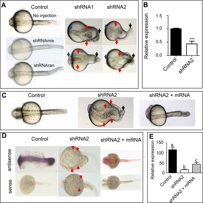 Knockdown of Drfundc1 caused abnormal body axis development in zebrafish embryos (A,B), which was repaired by Drfundc1 mRNA (CE). (A) Midline bifurcation and headless embryos caused by microinjection of Drfudnc1 shRNA1 or shRNA2 into zygotes at 24–28 hpf. (B) shRNA2 significantly decreased endogenous Drfundc1 in the embryos (***P < 0.001), as measured by qRT-PCR with normalization by β-actin. (C) Co-injection of Drfundc1 mRNA repaired defects caused by shRNA2. Before injection, 200 pg/nL of shRNA2 was mixed with 400 pg/nL of mRNA. Control embryos were not injected. (D) WISH results of Drfundc1 in embryos with different treatments. (E) Gray-scale analysis of WISH results of Drfundc1 (D), measured using ImageJ. Letters a, b, and c indicate significance (P < 0.05). All embryos were oriented with a dorsal view. Arrows point to abnormal sites in the embryos.