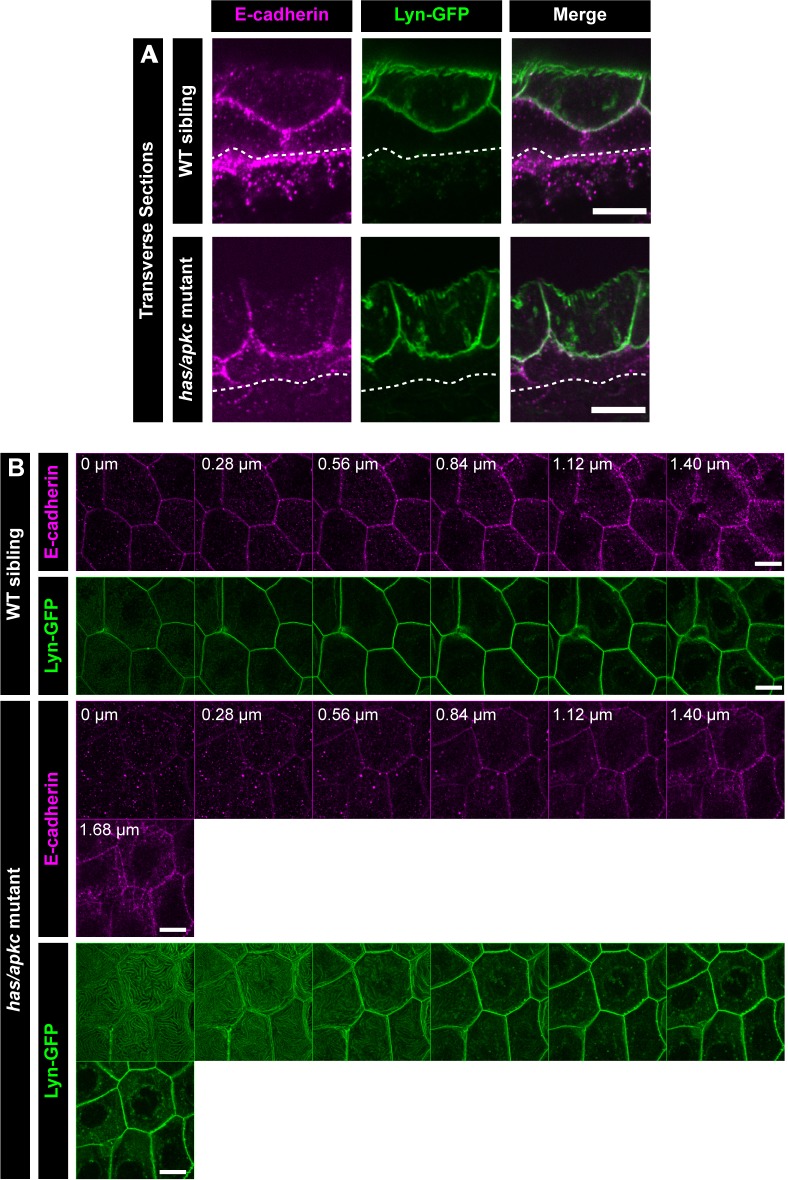 Transverse section through the dorsal head epidermis at 48hpf showing localisation of E-cadherin (magenta) and Lyn-GFP (green) along the apicobasal axis in WT siblings and
