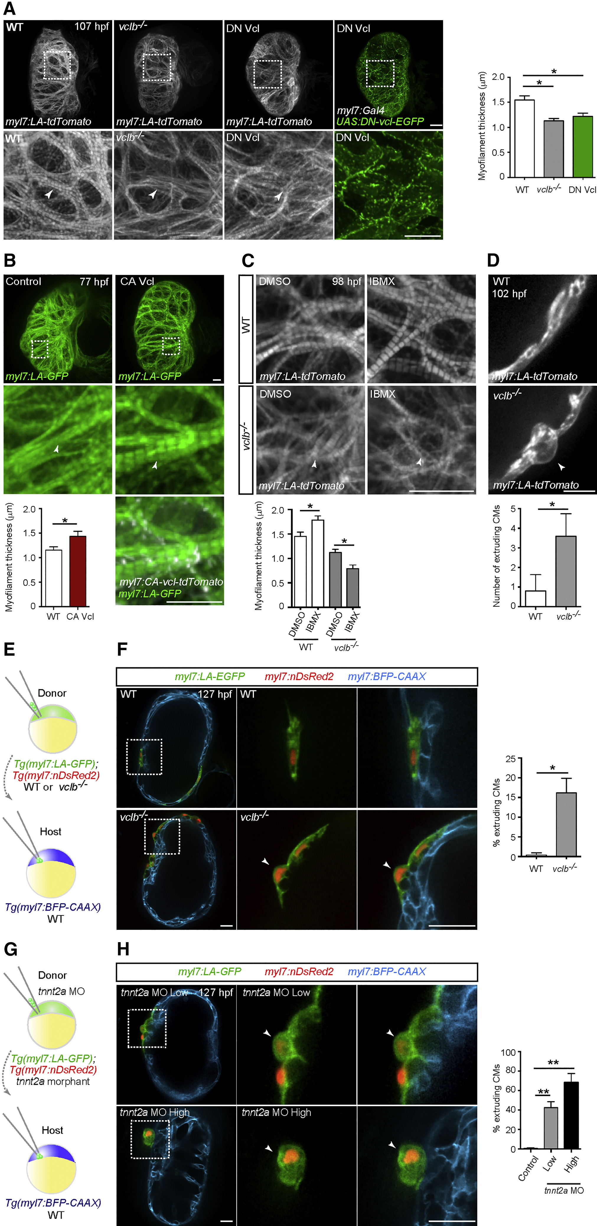 (F) Single-plane images of 127 hpf chimeric hearts treated with IBMX from 103 to 127 hpf. vclb−/− CMs extrude in chimeric hearts (arrowheads). Percentage of extruding CMs in 127 hpf chimeric ventricles (n = 5 ventricles).
