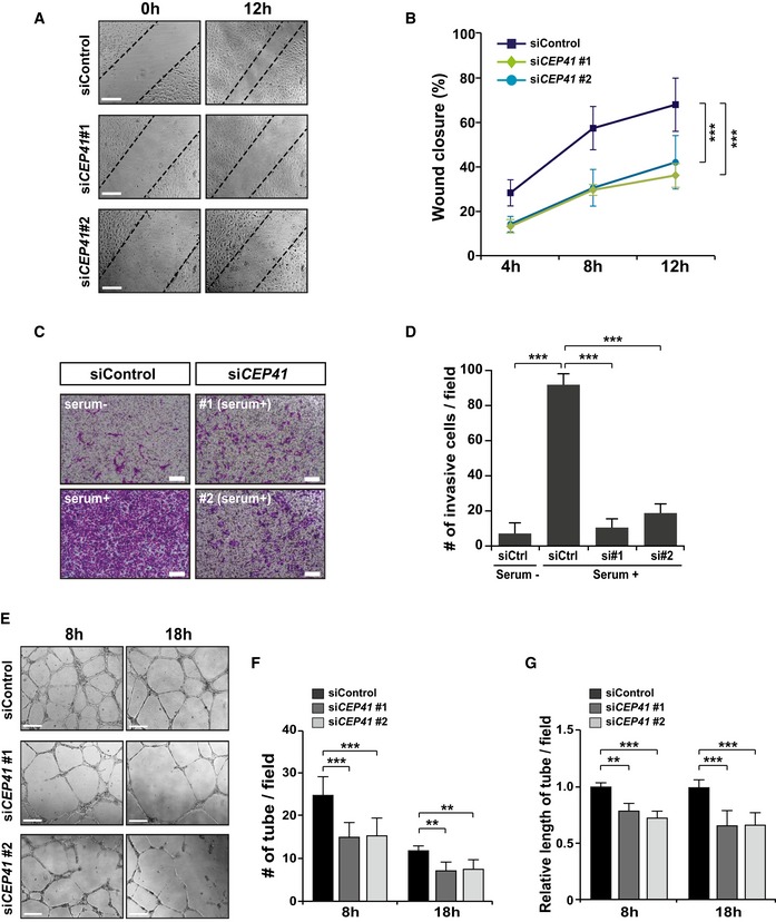 HUVECs transfected with control or The siRNA‐transfected HUVECs were plated inside a transwell chamber and incubated with serum for 18 h. The cells that invaded were observed after staining with crystal violet (CV) solution. Scale bars, 600 μm. The numbers of cells that invaded in each field of view were counted with the ImageJ software in (D). The data indicate the results of three independent experiments with ≥ 3 invasions per condition (mean ± SD). *** Tubulogenesis of control and