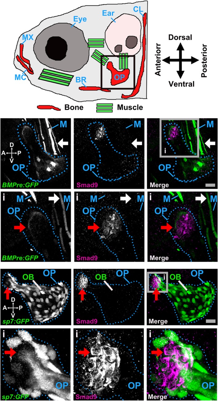 Smad9 protein expression in the larval zebrafish opercle bone. (A) Schematic of the larval zebrafish head (6 days post fertilization [dpf], lateral view), showing visible ossified elements (red) and the main muscle groups (green) that are green fluorescent protein (GFP)‐positive under control of the BMP‐responsive elements promoter (BMPre) transgenic reporter line (BMPre:GFP). The black box indicates the location of the intramembranous opercle bone as shown in B and C. (B) Distinct tissue distribution of Smad9‐ and BMP‐expressing cells (7 dpf). Upper left panel: BMPre:GFP‐positive cells (white) in the levator operculi muscle group (white arrow) and ventral (V) side of the opercle (OP; dotted blue outline); upper middle: distinct group of Smad9‐positive cells (white) in the dorsal (D) tip of the opercle; upper right: merged view showing distinct tissue expression of BMPre:GFP‐positive cells (green) and Smad9‐positive cells (purple); lower left: gray box inset (i) showing faint cap of BMPre:GFP‐positive cells at the dorsal tip of the opercle (red arrow); lower middle: cluster of Smad9‐positive cells; lower right: merged view confirming non‐overlapping distribution of BMPre:GFP‐positive cells and Smad9‐positive cells. Images from n = 4 larvae. (C) Distinct tissue distribution of Smad9‐ and osterix (Sp7)‐expressing cells (6 dpf). Upper left: Sp7:GFP‐positive osteoblasts (OB; white) within the opercle; upper middle: Smad9‐positive cells (white) in the antero (A)‐dorsal tip of the opercle (red arrow); upper right: merged view showing separation of Sp7:GFP‐positive cells (green) and Smad9‐positive cells (purple) (Supplemental Movie S1 in File S1); lower left: the inset (i, gray box) shows few Sp7:GFP‐positive osteoblasts within the dorsal tip of the opercle; lower middle: cluster of Smad9‐positive cells; lower right: merged view confirming non‐overlapping distribution of Sp7:GFP‐ and Smad9‐positive cells. Images from n = 6 larvae. (B, C) Scale bar = 20 μm; all are maximum‐intensity z‐projection confocal images. A = anterior; BR = branchiostegal ray; CL = cleithrum; D = dorsal; M = muscle; MC = Meckel's cartilage; MX = maxilla; OB = osteoblast; OP = operculum; P = posterior; V = ventral.