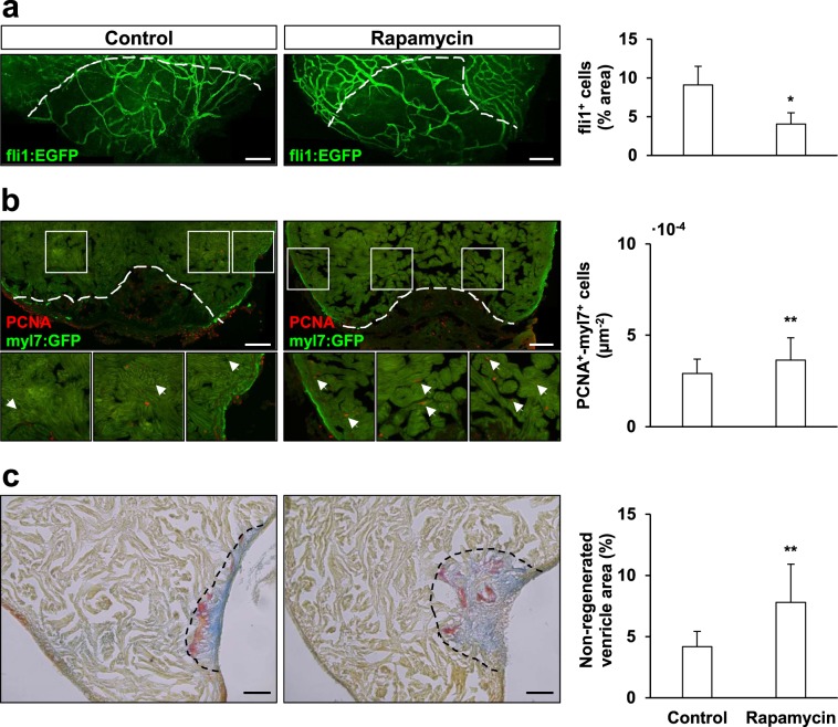 Rapamycin treatment affects zebrafish cardiac regeneration. Rapamycin-treatment affected angiogenesis upon amputation, causing a negative effect in the re-vascularization rate of the regenerating zebrafish ventricle at 7 dpa (