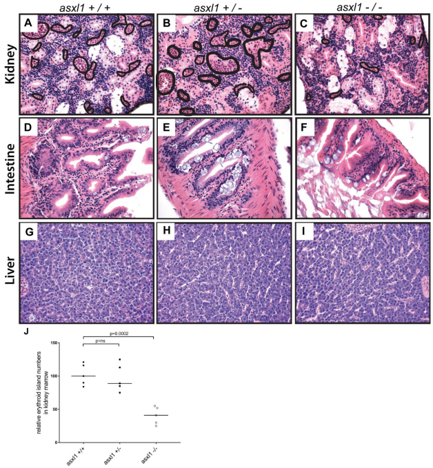 Fig. S2 Histopathological analysis of kidney, intestine and liver development in 17-month-old asxl1+/+ and asxl1+/- and asxl1-/- fish. Results revealed that intestine (D, E and F) and liver (G, H and I) was normal and similar to that of the fish, indicating that these fish recovered from early developmental hypoplasia in these organs. However, asxl1-/- mutants did have decreased numbers of erythroid islands in the kidney marrow compared with asxl1+/+ and asxl1+/- fish (A, B and C), indicating that the hematopoietic system is abnormal in these animals. Area encircled with black line indicates erythroid islands. The quantification of erythroid islands was shown in (J), with the black bars representing the median values. ns p>0.05, *p<0.05, **p<0.01 by two-tailed unpaired t-test.