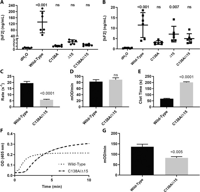 Expression and activation of prothrombin variants and resulting activity of thrombin upon activation. (A) Measurement of prothrombin in the cell media by ELISA demonstrated that expression of prothrombin variants in HEK293T cells resulted in reduced secretion levels that were indistinguishable from control and (B) corresponding measurement of prothrombin in the cell lysate demonstrated decreased biosynthesis. (C) Rates of prothrombin activation by prothrombinase measured using DAPA. Once prothrombin variants were fully activated by prothrombinase, their ability to cleave synthetic substrate S-2238 (D) or fibrinogen (E) were monitored, with significant differences in the latter, but not the former. For both S-2238 and fibrinogen, the rate was calculated during the initial reaction phase when the substrate is non-limiting and the conditions are presumed to be steady-state. Rate was then normalized to enzyme concentration. (F) Clotting profile between wild-type and C138A/Δ15 demonstrated delayed clot initiation and altered turbidity. (G) The rates of clot formation were determined from the clotting profile and reduced in the mutant.