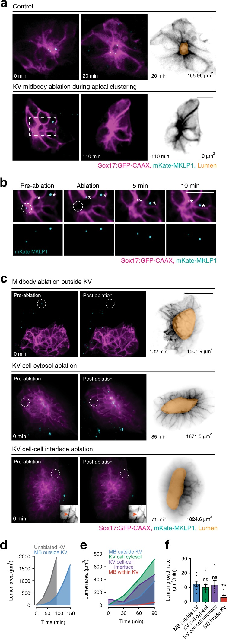 a Top: unablated control embryo during apical clustering (left) and lumen formation (center, right). Bottom: central KV midbody ablated during apical clustering from experimental ablation group (left). Subsequent failed lumen formation shown (center, right). KV membrane (Sox17:GFP-CAAX, magenta) and midbody marker (mKate-MKLP1, cyan) shown in the left and center panels; KV membrane (Sox17:GFP-CAAX, gray) and lumen trace (orange) shown on the right. Bar, 20 μm. b Midbody ablated in a. Pre-ablation, immediately post ablation, and at 5 and 10 min post ablation shown. KV cell membrane (Sox17:GFP-CAAX, magenta) and midbodies (mKate-MKLP1, cyan) shown. Additional unablated midbodies depicted with asterisks. Bar, 10 μm. c Representative 3D renderings of KV pre-ablation (left), immediately post ablation (center), and after lumen formation (right) in control groups. Ablation control conditions shown: midbody ablation outside KV (top), KV cell cytosol ablation (middle), KV cell–cell interface ablation (bottom). KV membrane (Sox17:GFP-CAAX—magenta or grayscale), midbodies (mKate-MKLP1—cyan), and lumen trace (orange) shown. Ablation location shown by dotted white circle. Grayscale inset in bottom panel depicts ablation at cell–cell interface within KV (Sox17:GFP-CAAX). d, e Graphs depicting average lumen area over time for unablated (gray) embryos and embryos with midbody ablated outside KV (blue, d), or for embryos with ablation at midbody outside KV (blue, e), KV cell cytosol (green, e), KV cell membrane (purple, e), and midbody within KV (red, e). Lumen areas averaged and binned every 30 min. f Bar graph depicting rate of lumen area expansion over time. Dots represent individual values. dfn > 6 embryos/condition across n > 3 experiments. ANOVA with Dunnett’s multiple comparison test completed for df compared with embryos with midbody ablated outside KV (blue). Mean displayed ± SEM (f). Statistical results detailed in Supplementary Table 5.