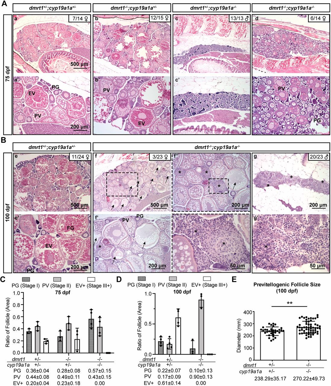 Fig. 2 Phenotype analysis of female zebrafish in different genotypes. (A,B) Histological examination of gonads in different genotypes of dmrt1;cyp19a1a at 75 dpf (A) and 100 dpf (B). PG, primary growth; PV, pre-vitellogenic; EV, early vitellogenic; FG, full grown. Arrows indicate atresic/degenerating follicles. Asterisks indicate stromal cells. (C,D) Ratios of PG, PV and vitellogenic (EV+) follicle areas in different genotypes at 75 dpf (C) and 100 dpf (D). Data are mean±s.d. The exact values are shown under the x-axis. (E) The size of PV follicles in controls and double mutants (dmrt1−/−;cyp19a1a−/−) at 100 dpf. Each dot represents the average diameter of PV follicles with visible germinal vesicles from each fish (quantified from three different sections). Data are mean±s.d. and the exact values are shown under the x-axis. Statistical significance was revealed by two-tailed unpaired Student's t-test (**P<0.01).