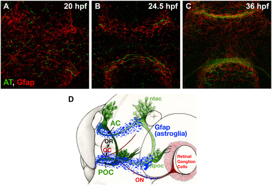 Fig. 1 Post-optic commissure formation in zebrafish embryos. The post-optic commissure (POC) is formed by midline crossing axons (AT) in concert with a structure of glial cells called the glial bridge (Gfap). A) Frontal MIP of the zebrafish forebrain at 20 hpf labeled with anti-acetylated tubulin (AT) (green) and anti-Gfap (red). Gfap signal is distributed across the whole forebrain with the glial bridge beginning to condense in both the telencephalon (top half) and diencephalon (bottom). The first pioneering axons are visible in the diencephalon, where they will construct POC. B) Frontal MIP of the zebrafish forebrain at 24.5 hpf labeled with AT and Gfap. Axons (green) are observed pioneering the diencephalic midline, forming the POC, in concert with the glial bridge which has condensed around the forming commissure. C) Frontal MIP of the zebrafish forebrain at 36 hpf labeled with AT and Gfap. Both the diencephalic POC and telencephalic anterior commissure have been successfully constructed and positioned at the midline in concert with their respective glial bridges. D) Model of the commissure (green) and glial bridge (blue) positioning in the zebrafish forebrain with respect to the eye and dorsal and ventral clusters.