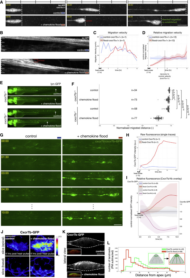 Fig. 2 Tissue Migration Rapidly Adapts to a Chemokine Flood, a Response that Is Sensitive to Cxcr7b Levels (A and B) Time lapse of lateral line migration (cldnB:lyn-GFP) in cxcr7b+/+ embryos in control (top: temperature shifted without hsp70:mCherry-cxcl12a transgene) and chemokine flood (bottom: after induction of hsp70:mCherry-cxcl12a) (A) and corresponding kymographs (B). Scale bars, 100 μm (A) and 50 μm (B). Timescale 1 h per bar. See Video S1A. (C) Lateral line migration velocity over time (h post-heat shock); control (blue) and chemokine flood (red). (D) Migration velocity in chemokine flood (n = 12, red) relative to the mean of control (n = 12, blue). Shadings, standard deviations. (E) Migration in cxcr7b+/+ or cxcr7b+/− embryos 24 h after chemokine flood. hsp70:mCherry-cxcl12a transgenics distinguished by the green heart marker (clmc2:GFP, asterisk). (F) Boxplot, median, and quantiles of normalized distance migrated. Statistics: p values indicated on the plot. (G) Time lapse of the Cxcr7b-GFP-expressing lateral line in control (left) or chemokine flood (right). Scale bar, 50 μm. See Video S2. (H) Cxcr7b-GFP fluorescence intensity over time, control (blue) and chemokine flood (red). (I) Cxcr7b-GFP and Cxcr4b-GFP intensities in chemokine flood relative to the mean of the control over time. Cxcr7b-GFP n = 30 and 29 and Cxcr4b-GFP n = 9 and 9. (J) Images of Cxcr7b-GFP in control (left) or chemokine flood (right). Single optical slices allow intensity comparison (calibration bar, signal intensity). Scale bar, 10 μm. (K) Lateral views of (J). Insets: Cxcr7b-GFP with PM label (krt15:lyn-RFP). Scale bar, 10 μm. (L) Quantification of the distance of local fluorescence point densities from tissue apex in control and chemokine flood.