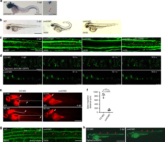 a WISH of a WT embryo at 2 dpf with cx43 riboprobes (left). Lateral view anterior to the left. Right panel shows the cross-section image of the SC ventral to the bottom. Arrowhead indicates ECs. Scale bars = left: 650 μm; right: 20 μm. b Embryos at one-cell stage were microinjected with cx43 MO and imaged at 2 dpf. Lateral view anterior to the left. Scale bar = 650 μm. c Embryos at one-cell stage were microinjected with either control MO or cx43 MO or cx43 MO + mouse Cx43 mRNA, and IF stained with anti-acetylated α-tubulin antibody at 2 dpf. Arrowheads represent spinal motile cilia. Dorsal view anterior to the left. Scale bar = 20 μm. dTg(bactin2:Arl13b-GFP) embryos expressing GFP in motile cilia were microinjected at one-cell stage with either control (CO) MO or cx43 MO and subjected to time-lapse imaging for 2 min (6.7 frames s−1) with an intravital multiphoton microscope. Dorsal view anterior to the left. Scale bar = 7.5 μm. e Embryos at one-cell stage were microinjected with control MO or cx43 MO and Qdots were microinjected into the hindbrain ventricles of larvae at 4 dpf, which were then imaged at 10 min and 60 min after the microinjection. Dashed lines indicate migration of Qdots. Arrowheads mark the caudal end of Qdot flow. Lateral view anterior to the left. Scale bar = 650 μm. Insets represent magnifications of the dotted areas. CO: Control. f Quantification of Qdot migration distance in the larvae shown in d. Mean ± SD. ***P < 0.001 by two-tailed unpaired Student’s t test (n = 3 larvae per group). g Embryos at one-cell stage were microinjected with either control MO or cx43 MO and immunostained with anti-γ-tubulin antibody at 2 dpf. Arrowheads indicate motile cilia. Dorsal view anterior to the left. Scale bar = 20 μm. hTg(foxj1a:eGFP) embryos expressing GFP in ECs were microinjected with either control MO or cx43 MO and imaged at 2 dpf. Arrowheads represent spinal ECs. Dorsal view anterior to the left. Scale bar = 650 μm.