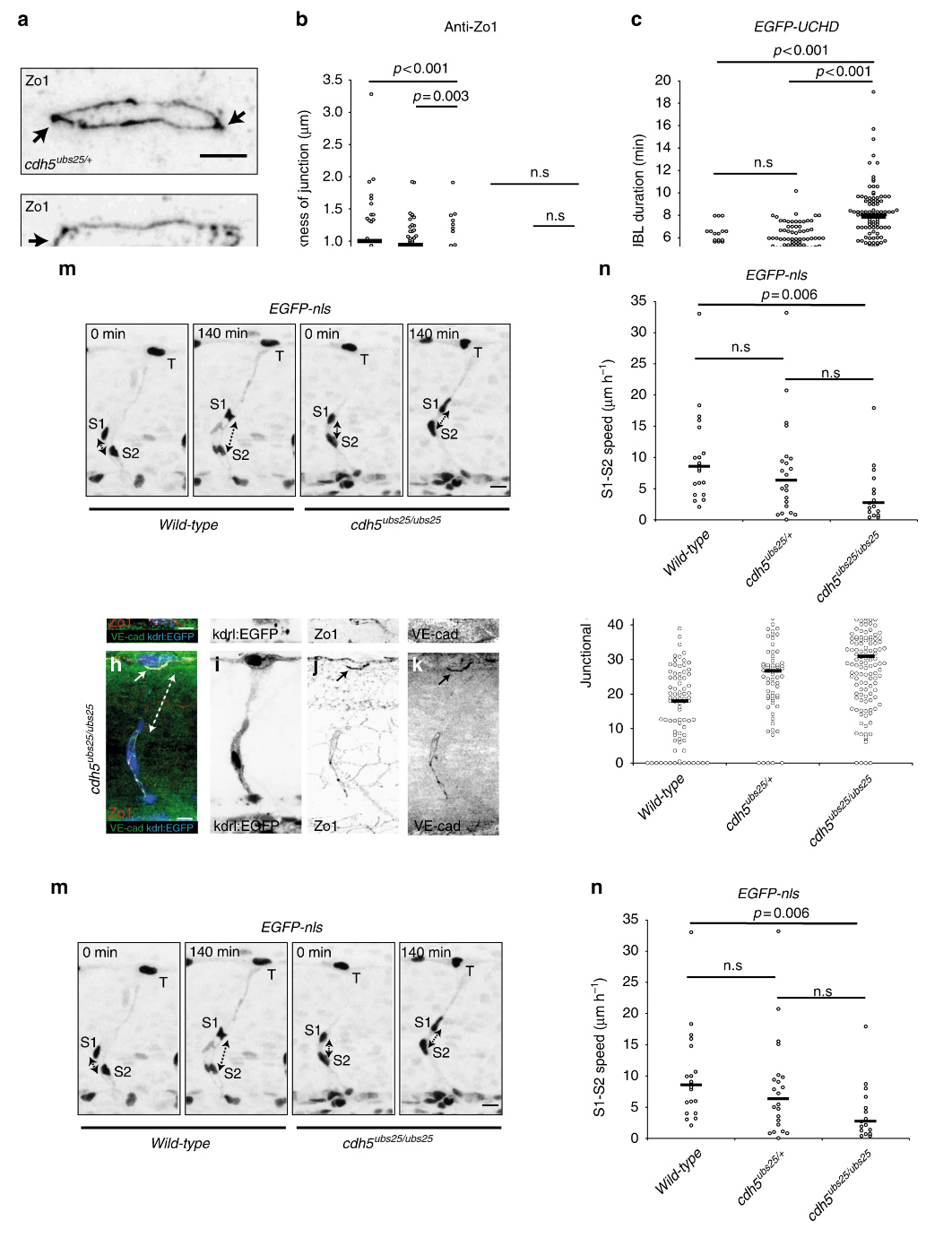 Fig. 7 Truncation of Ve-cadherin inhibits both JBL and endothelial cell remodeling. a Images of anti-ZO1 immunostained junctions in cdh5ubs25/+ and cdh5ubs25/ubs25 embryos. Arrows point to medial site of the junction. b Quantitation of the medial and lateral junctional thickness, based on immunostaining for ZO1; cdh5ubs25/+, n = 44 junctions (17 embryos); cdh5ubs25/ubs25, n = 40 (11 embryos); wild-type n = 28 (9 embryos). Black lines are medians. Non-parametric Kruskal–Wallis statistical test was used. c Quantitation of the duration of JBL based on EGFP-UCHD signal; cdh5ubs25/+, n = 122 (8 embryos), cdh5ubs25/ubs25 n = 103 (8 embryos) and wild-type n = 43 (3 embryos). All embryos carry the UAS:EGFP-UCHD transgene Tg(fli:GFFubs3;UAS:EGFP-UCHDubs18). d–l Tg(kdrl:EGFPs843);cdh5ubs25/+ (d–g) and Tg(kdrl:EGFPs843);cdh5ubs25/ubs25 (h–k) embryos stained for VE-cadherin (rabbit antibody, green) and ZO1 (red). Individual channels are shown in inversed contrast. Both wild-type and mutant VE-cad show junctional localization (solid arrow in panels d, f, h, and j). The junctional gap in the VE-cadherin staining of a SeA in a mutant embryo (cdh5ubs25/ubs25) is marked with dashed double arrow in panel h. l Quantification of the length of junctional gaps in control (cdh5 ubs25/+, n = 72 gaps, 23 embryos) and mutant (cdh5ubs25/ubs25, n = 139 gaps, 33 embryos) embryos. Black lines are medians. Non-parametric Mann–Whitney statistical test was used. m Still images from a confocal time-lapse of endothelial nuclei (Tg; kdrl:nlsEGFPubs1) in wild-type or cdh5ubs25/ubs25 embryos during SeA formation. T tip cell, S1 stalk cell 1, S2 stalk cell 2; double-headed arrow indicates the distance of S1 and S2 nuclei. n Quantification of movement of stalk cell 1 (S1) nuclei in relation to stalk cell 2 (S2) nuclei during cell rearrangements in SeA; cdh5ubs25/+, n = 22 SeA (4 embryos); cdh5ubs25/ubs25, n = 17 SeA (4 embryos); wild-type n = 20 SeA (4 embryos). Black lines are medians. Non-parametric Kruskal–Wallis statistical test was used. Scale bars 5 µm (a), 10 µm (d, h, m)