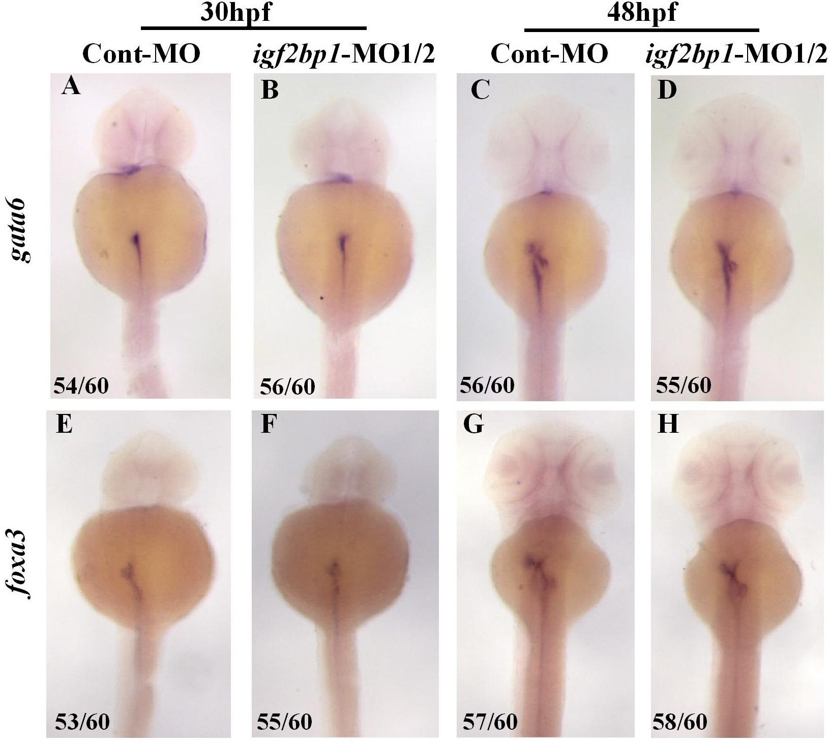 Fig. 4 Igf2bp1 is required for hepatic outgrowth but not for hepatoblast specification and budding. Whole-mount in situ hybridization of the early endoderm marker gene expression in Cont-MO (A, C, E and G) and igf2bp1-MO1/2 (B, D, F and H) embryos at 30 and 48 hpf.