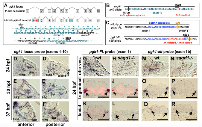 (A) Exon-intron structure of the primary full-length pgk1 transcript (pgk1-FL) and alternate transcript (pgk1-alt) arising from an independent transcription start site containing two novel exons (1a and 1b) that splice in-frame to exon 2, and a third novel exon (6a) containing a stop codon. The nucleotide and peptide sequences of exons 1b and 6a are shown. Relative positions of the lesions in sagd1 affecting exon 1b are indicated (red asterisks). (B) Nucleotide sequence near the 5’ end of exon 1b showing the SNPs detected in sagd1 (red font). (C) Nucleotide sequence of pgk1-FL showing the sgRNA target site (blue font) and the altered sequence of the x55 mutant allele (red font), which introduces a premature stop codon. (D–F’) Cross sections through the otic vesicle (outlined) showing staining with ribo-probe for the entire pgk1 locus (covering both pgk1-FL and pgk1-alt) in wild-type embryos. Note elevated expression in the SAG, utricular macula (um), and saccular macula (sm). (G, H, M, N) Cross sections through the otic vesicle (outlined) in wild-type embryos and sagd1 mutants stained with ribo-probe for exon 1 (pgk1-FL alone) (G, H) or exon 1b (pgk1-alt alone) (M, N). Accumulation of both transcripts is dramatically reduced in sagd1 mutants. (I–L, O–R) Cross sections through the hindbrain (dorsal up) showing expression of pgk1-FL (black) plus neurod (red) (I–L) or pgk1-alt alone (O–R). Arrows indicate positions of the trigeminal and facial ganglia. Scale bar, 100 µm.