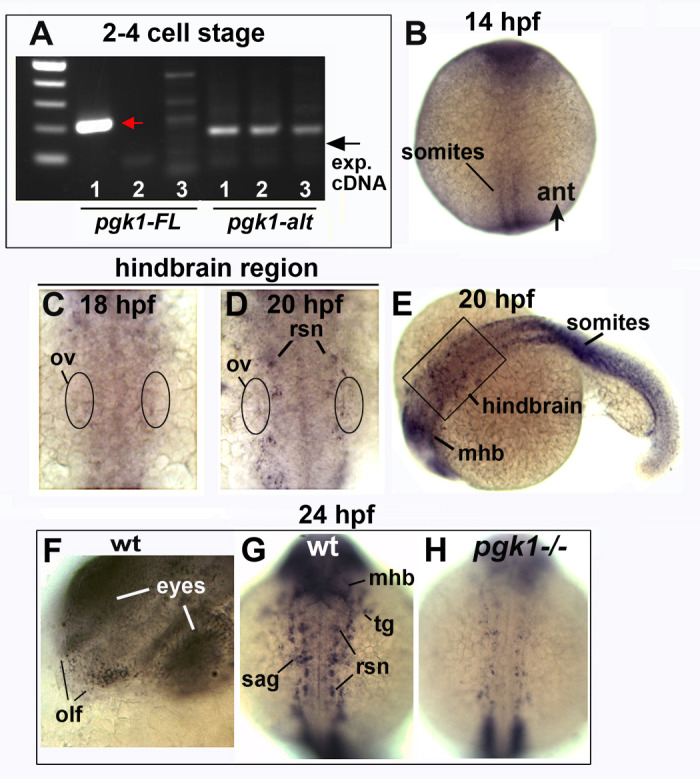 (A) RT-PCR for pgk1-FL and pgk1-alt conducted on mRNA harvested at the 2–4 cell stage (lane 1), mRNA samples excluding reverse transcriptase (lane 2), or genomic DNA (lane 3). The expected 211 bp amplicon was obtained for pgk1-FL (red arrow), but not the 163 bp amplicon (exp. cDNA) for pgk1-alt (black arrow). (B–H) Whole mount in situ hybridization for pgk1-FL at the indicated times. Images show dorsal views with anterior to the top (B–D, G,H) or lateral views with anterior to the left (E, F). Expression of pgk1-FL shows the first signs of upregulation in developing somites at 14 hpf (B), whereas diffuse upregulation becomes evident in the hindbrain region beginning at 18 hpf (C) and becomes more intense in developing reticulospinal neurons (rsn) by 20 hpf (D). The position of the otic vesicle (ov) is indicated. The specimen in (D) is depicted at lower magnification in (E) and shows that expression of pgk1-FL also increases in the midbrain-hindbrain border (mhb) and somites. (F–H) Expression of pgk1-FL at 24 hpf in wild-type embryos (F, G) and a pgk1- / - mutant (H). In wild-type embryos local upregulation increases near sites of Fgf expression, including the olfactory epithelium (olf), SAG, midbrain-hindbrain border (mhb), the trigeminal ganglion (tg) and reticulospinal neurons (rsn). Expression is strongly reduced in pgk1- / - mutants.