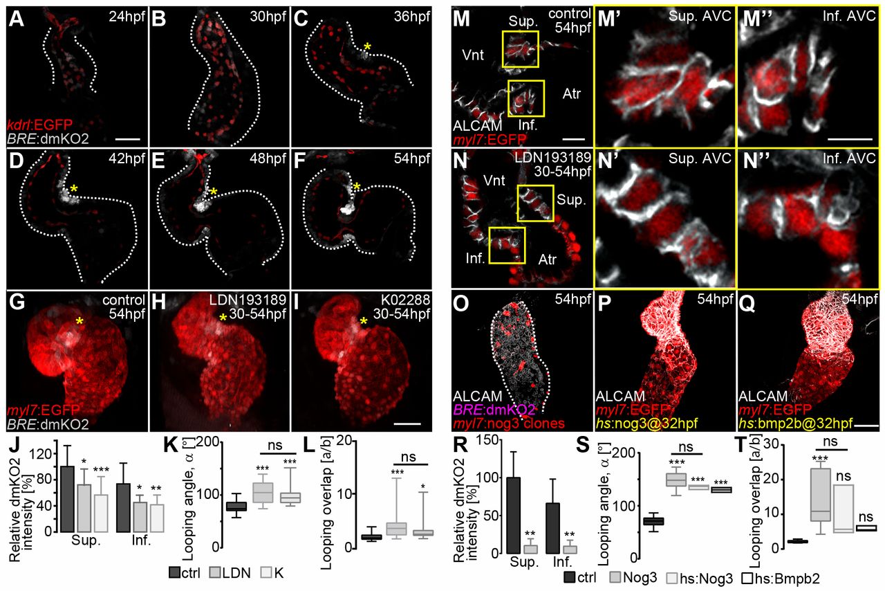 Fig. 3 Bmp signaling activity is asymmetric during S-looping morphogenesis. (A-F) Reconstructions of confocal z-scans of wild-type hearts expressing the Bmp signaling reporter transgene Tg(BRE:dmKO2)mw40 (false-colored gray) in combination with the Tg(kdrl:EGFP)s843 endocardial/endothelial reporter line (false-colored red) during heart looping morphogenesis (myocardium, dotted lines). (A,B) Initially, Bmp signaling is present within the entire endocardium and only weakly expressed within the myocardium. During early (C,D) and advanced (E,F) S-looping stages, BMP activity increases at the superior AVC (yellow asterisks) and more weakly at the inferior AVC. (G-L) Pharmacological inhibition of Bmp signaling using LDN193189 (20 μM) and K02288 (20 μM) inhibitors between 30 and 54 hpf. (G-I) Reconstruction of confocal z-stacks of the Bmp Tg(BRE:dmKO2)mw40 and myocardial Tg(mly7:EGFP)twu34 (false-colored red) reporter lines treated with (G) 0.2% DMSO (control), (H) LDN193189 or (I) K02288. Both LDN193189 and K02288 result in defective cardiac looping. Yellow asterisks highlight Bmp signaling within myocardium. (J-L) Bmp inhibition decreases the relative dmKO2 intensity at the superior (Sup.) and inferior (Inf.) AVC (J), increases the looping angle (α) (K) and decreases the looping overlap (increase in the index a/b) (L). (M-N″) Myocardial cell morphologies within the superior and inferior AVC after Bmp inhibition. (M,N) Single z-stack section images of ALCAM immunolabeled (false-colored white) and Tg(myl7:EGFP)twu34 myocardial reporter-expressing hearts (false-colored red) of embryos treated (M) with 0.2% DMSO (control) or (N) with LDN193189 between 30 and 54 hpf. (M′-N″) Enlargements of the areas outlined in M and N. Whereas myocardial cells at the superior AVC of control hearts have a columnar and conical shape (M′), the morphologies of AVC cells are cuboidal after Bmp inhibition (N′). Myocardial cells at the inferior AVC are cuboidal in control (M″) and in LDN-treated (N″) hearts. (O-T) Alterations in BMP signaling affect cardiac S-looping. (O-Q) Reconstructions of confocal z-scans of representative hearts. (O) Clonal overexpression of the BMP antagonist Noggin 3 causes a downregulation of the Bmp reporter transgene Tg(BRE:dmKO2)mw40 within the heart and an abnormal morphology. Overexpression of either (P) Noggin 3 [Tg(hsp70I:Nog3)fr14 transgenic line] or (Q) Bmp2B [Tg(hsp70:Bmp2b)fr13 transgenic line] by heat shock at 32 hpf causes cardiac looping defects at 54 hpf. (R) Clonal overexpression of Noggin 3 decreases expression of the Bmp reporter transgene Tg(BRE:dmKO2)mw40 at the superior (Sup.) and inferior (Inf.) AVC (Table S5). (S,T) Misregulated Bmp signaling causes an increase in looping angles (α) (Table S1) (S) and in the index a/b (Table S1) (T). In K,L,S,T, the limits of the boxes indicate the range between the first quartile (25th percentile) and the third quartile (75th percentile). The line inside box indicate the median value. The error bars indicate the maximum and minimum values. Data are mean±s.d. in J,R; ns, not significant; *P≤0.05; **P≤0.01; ***P≤0.001. Scale bars: 50 μm in A-I,O-Q; 20 μm in M,N; 10 μm in M′-N″.
