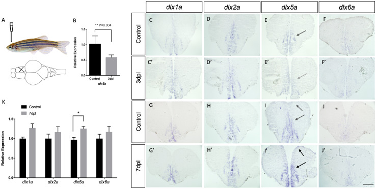 Top left panel (A) shows the location of the mechanical lesion. Expression of the four dlx paralogs in controls (C-F and G-J) and lesioned brains at 3 dpl (C’-F’) and 7 dpl (G’-J’). Down-regulation of dlx5a is suggested at 3dpl (E’ indicated by gray arrow) and confirmed by RT-qPCR (B) (Student’s t-test, n = 5, p = 0.004). A slight up-regulation of dlx2a and dlx5a is seen at 7dpl compared to controls. For each gene, and for each time point, assays were carried out with at least 2 biological replicates in 3 different experimental repetitions (N = 6). RT-qPCR analyses at 7dpl (K) reveals no significant changes in expression levels of dlx1a, dlx2a and dlx6a (N = 7 for each gene each). A significant increase in dlx5a expression was observed at 7dpl (Student’s t-test, n = 7, p = 0.008). Scale bar: 400 μM.