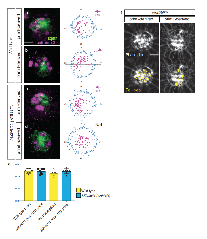 Fig. s7 Emx2+ expression analysis and hair cell orientation in wntSb mutants. a-e. Distribution, but not ratio of expression, of Emx2+ hair cells is affected in primll-derived neuromasts of MZwnt11 (wnt11f1) mutants. Antibody staining for the transcription factor Emx2 in 5dpf Wild type (a- b) and MZwnt11 (MZwnt11f1) mutants (c-d). ln Wild type, Emx2+ hair cells are biased towards the anterior pole of the priml-derived neuromasts (a, Binomial test p=val 7.6 x 10^-06) and towards the dorsal pole in primll-derived neuromasts (b, p-val=7 x 10^-04). ln MZwnt11 (wnt11f1) mutants, the distribution is still biased in priml-derived neuromasts (c, p-val=8.S x 10^-10) but it is disrupted in primll-derived neuromasts (d, p-val=0.2). Additionally, in both wild type and MZwnt11 (wnt11f1) mutants, approximately half of the hair cells express Emx2 (e). f. Phalloidin staining of priml and primll-derived neuromast in a 5dpf wnt5bti265 mutant fish, showing no hair cell orientation defects. The arrows in a-c indicate the direction of bias in each case. *** denotes statistical significance for biased location. N.S= not significant. Error bars in e represent Standard Deviation. Scale bar in a equals 10µm, f equals 5µm.