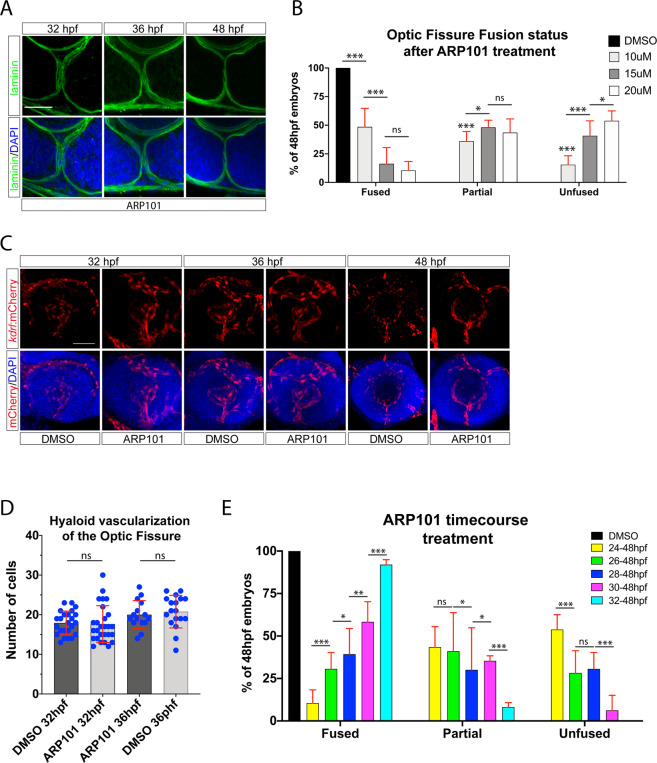 Proper timing of mmp2 activity is required for optic fissure fusion. (A) Whole mount Immunohistochemistry was used to visualize laminin (green) and DAPI (blue) in ARP101 treated Tg[rx3:GFP] embryos at 32, 36 and 48 hpf. Stacks of central-proximal regions of the OF are displayed. Scale bar = 50 μm. (B) Quantification of 48 hpf ARP101 treated embryos for fissure fusion (absence of laminin signal), partial fusion (partial retention of laminin) or failure to fuse (retention of laminin throughout the fissure). n = 41 (10 μM), 38 (15 μM), 42 (20 μM) ANOVA p < 0.0001. (C) 3D reconstructions of whole mount Tg[kdrl:mCherry] (red) embryos treated with 20 μM ARP101 from 24-32, 36 or 38 hpf. DNA was stained with DAPI (blue). Scale bar = 50 μm. (D) Quantification of the number of mCherry positive cells from 3D confocal stacks within the region of the OF after DMSO or 20 μM ARP101 treatment. Individual embryo results are depicted. (E) Quantification of 48 hpf ARP101 treated embryos for fissure fusion, partial fusion or failure to fuse after various treatment initiation times from 24-32 hpf. n = 42 (24-48 hpf), 29 (26-48 hpf), 29 (28-48 hpf), 23 (30-48 hpf), 37 (32-48 hpf). ANOVA p < 0.0001.