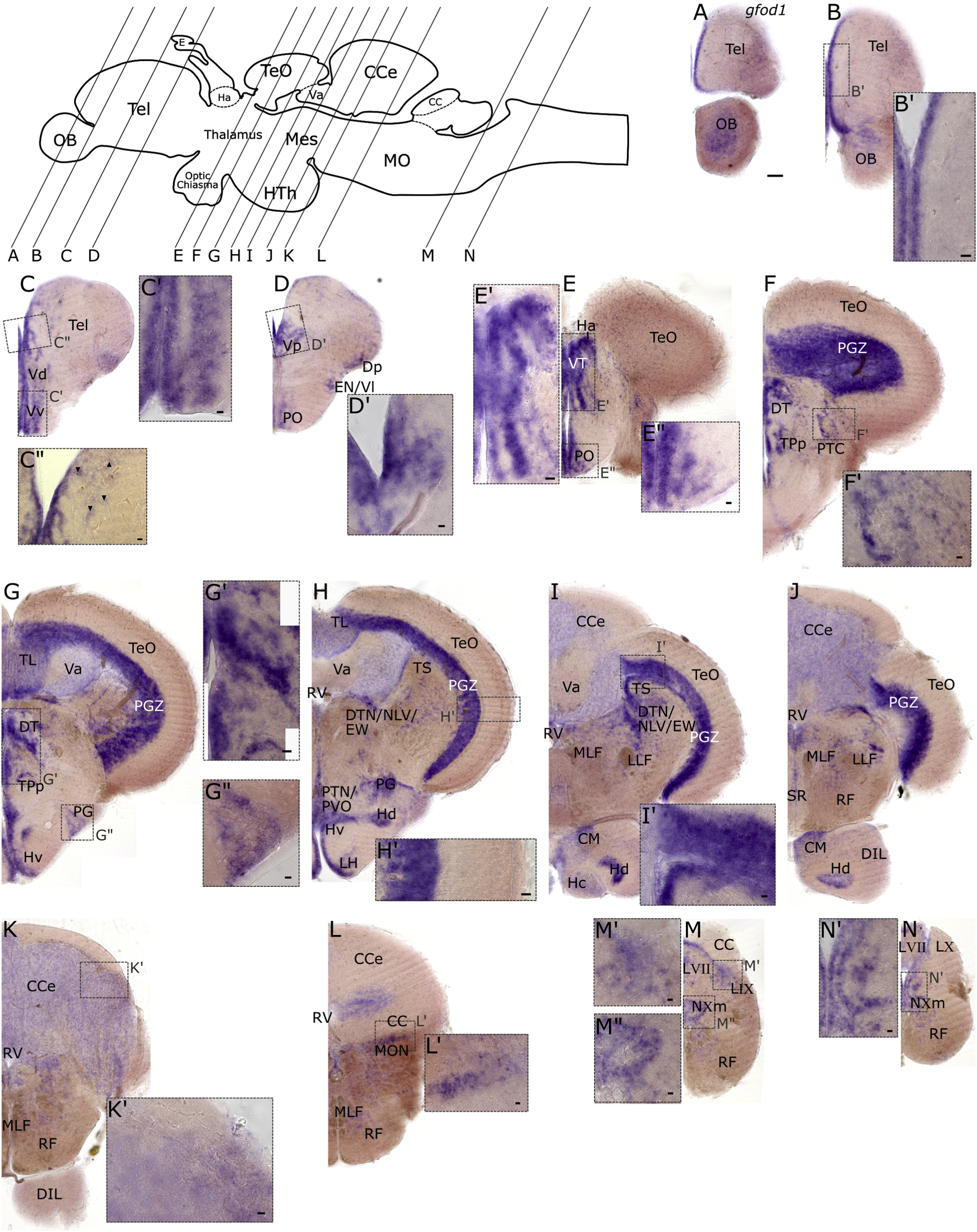 Fig. 6 RNA in situ hybridization for gfod1 in adult brain. Pictures show cross sections (80 μm) arranged from anterior to posterior as indicated in the lateral view scheme. B′-I′, K′-N′, C″, E″, G″ and M″ are high magnifications of boxed areas in A-I, K–N. Black arrowheads in C″ indicate examples of single positive cells in the dorsal telencephalic parenchyme. For abbreviations see abbreviation list (Table 1). Scale bar in A, 100 μm and pertains to B–N; scale bars in B′-I′, K′-N′, C″, E″, G″ and M″, 20 μm. The scheme is based on Wulliman et al., 1996.