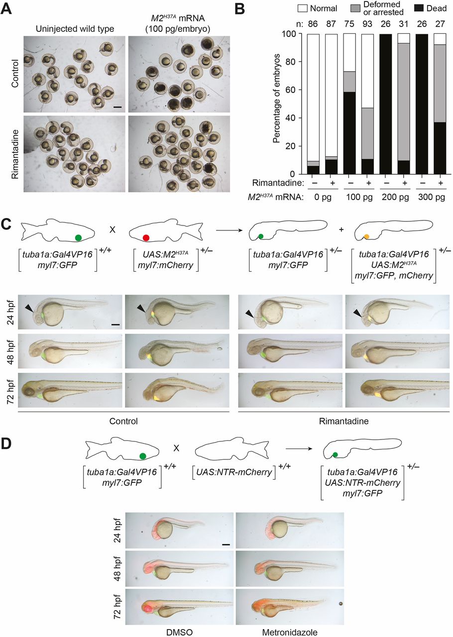 M2H37A channel variant is toxic to zebrafish embryos and ablates neurons more rapidly than NTR. (A) Wild-type zygotes were injected with the designated amount of M2H37A mRNA and cultured in the absence or presence of 100 μg/ml rimantadine. Representative bright-field micrographs of 24 hpf embryos from two independent experiments are shown. Scale bar: 500 μm. (B) Phenotypic distributions of embryos injected with the designated amount of M2H37A mRNA. The embryos were scored at 24 hpf, and the number of embryos (n) per condition from two or three independent experiments is indicated. Statistical analyses: χ2=389, d.f.=14, P<0.00001. (C) Comparison of Tg(tuba1a:Gal4VP16;myl7:GFP) and Tg(tuba1a:Gal4VP16; UAS:M2H37A;myl7:gfp,mCherry) embryos cultured in the absence or presence of 100 µg/ml rimantadine. Neuronal expression of M2H37Ainduces loss of the midbrain-hindbrain boundary (arrowheads) at 24 hpf and increasingly severe CNS deficits as development continues. Treatment with rimantadine starting at 10 hpf rescues these neuronal defects in Tg(tuba1a:Gal4VP16;UAS:M2H37A;myl7:gfp,mCherry)embryos. Representative bright-field and epifluorescence micrographs (overlays) from three independent experiments are shown. (D) Comparison of Tg(tuba1a:Gal4VP16;UAS:NTR-mCherry;myl7:GFP) embryos cultured with 5 mM metronidazole or an equivalent amount of DMSO, starting at 10 hpf. Metronidazole-treated embryos first exhibit CNS defects at 48 hpf. Representative bright-field and epifluorescence micrographs (overlays) from two independent experiments are shown. All embryos are shown in lateral view, anterior left. Scale bars: 250 µm. Statistics for the observed phenotypes are in Table S1.