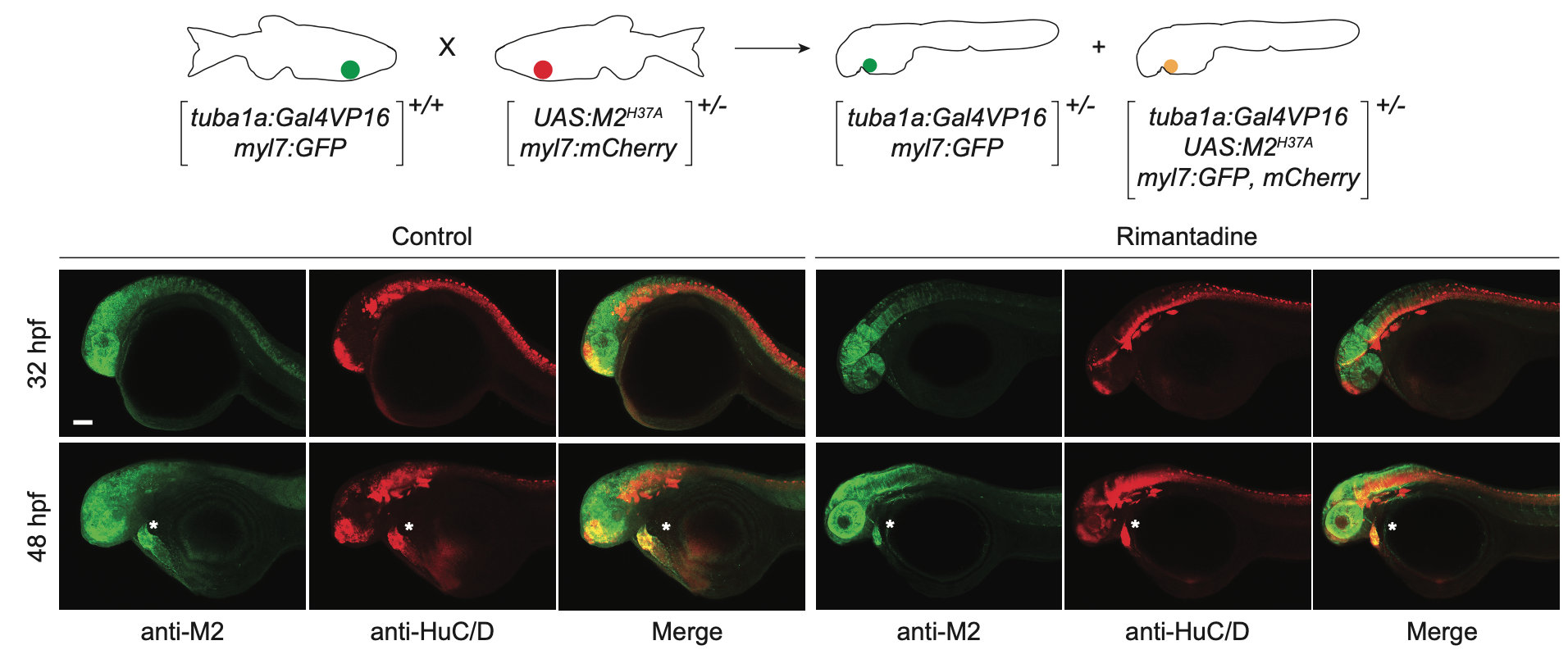 Neuron-specific expression of M2H37ARepresentative maximum intensity projection micrographs of heterozygousTg(tuba1a:Gal4VP16;UAS:M2H37A;myl7:GFP, mCherry) embryos immunostained for the M2-derived channel (green) or HuC/D (red), an early neuronal marker. Asterisks denote residual fluorescence from reporter genes expressed in the heart. Embryo orientations: lateral view, anterior left. Scale bar: 100 μm.