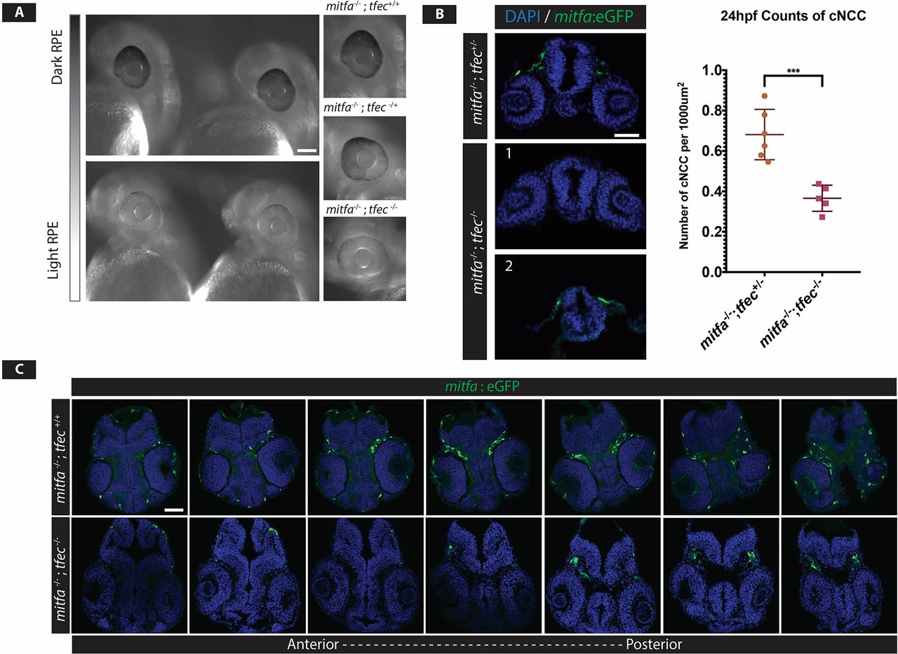 mitfa−/−;tfec−/− mutants display RPE and cNCC phenotypes. (A) At 48 hpf, mitf−/−;tfec+−/− and mitfa−/−;tfec−/− mutants display mild to severe hypopigmentation, respectively. The RPE eventually becomes normally pigmented by 4 dpf in both genotypes. (B) At 24 hpf, fewer cNCCs are present around the eye of mitfa−/−;tfec−/−;mitfa:GFP embryos than in the control (1) (***P=0.0007). However, mitfa−/−;tfec−/− mutants contain cNCCs posterior to the optic field (2). (C) Serial sections of mitfa−/−;tfec+/+;mitfa:GFP and mitfa−/−;tfec−/−;mitfa:GFP embryos at 48 hpf demonstrate that mitfa−/−;tfec−/− mutants possess fewer cNCCs in the POM surrounding the eyes. Dorsal is upwards in the images in B,C. Data are mean±s.e.m. Scale bars: 100 μm in A; 50 μm in B,C.