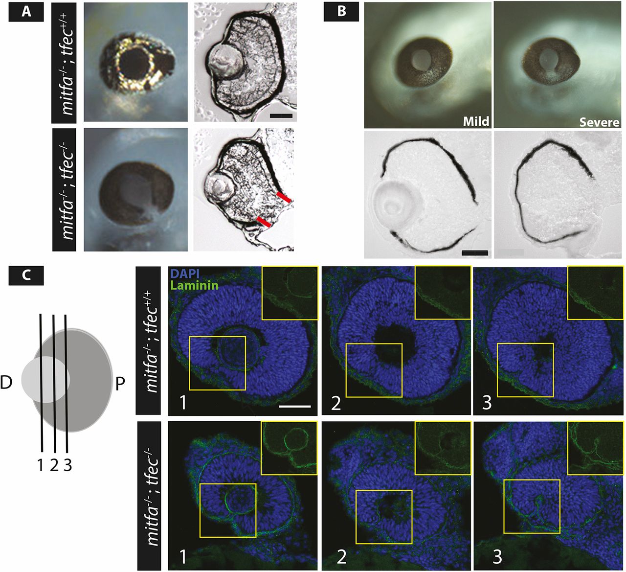 Zebrafish mitfa;tfec mutants phenocopy human colobomas. (A) At 4 dpf, mitfa−/−;tfec−/− mutants possess colobomas (outlined in red), with a range of severity (B). (C) At 48 hpf, serial sections through the distal (D) to proximal (P) axis of the CF reveal persistent expression of laminin in the mitfa−/−;tfec−/− mutant CF. The boxes indicate the areas enlarged in the insets showing laminin staining within the CF. Dorsal is upwards in all images. Scale bars: 50 µm.