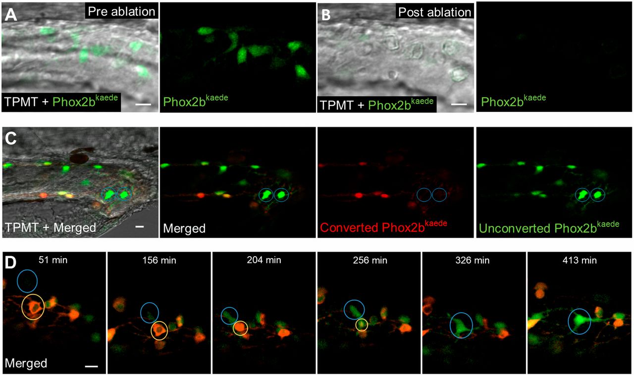 Fig. 4 De novo enteric neurons replace ablated neurons in a post-embryonic injury model. (A,B) Prior to two-photon laser ablation, Phox2b-kaede enteric neurons are clearly visualized within the hindgut (A). After ablation, these neurons are no longer present in the hindgut, and TPMT reveals the injury site to be restricted to the neuron location (B). (C) At 4.5 dpf, fish underwent laser ablation of ten enteric neurons within the distal hindgut, followed by photoconversion of all remaining enteric neurons within the whole length of the gut. Live imaging was performed 12 h later and detected multiple de novo green fluorescent-only enteric neurons in the hindgut. (D) 8 h time-lapse of a fish at 4.5 dpf that underwent focal injury (but not complete ablation) of enteric neurons followed by pan-gut photoconversion reveals the involution of an injured neuron (yellow circle) that is replaced by a de novo green fluorescent-only enteric neuron. The new neuron (blue circle) initially appears very faintly at the dorsalmost aspect of the intestine but increases in intensity as it migrates to replace the involuted neuron and extends projections to neighbouring neurons. Scale bars: 10 µm.