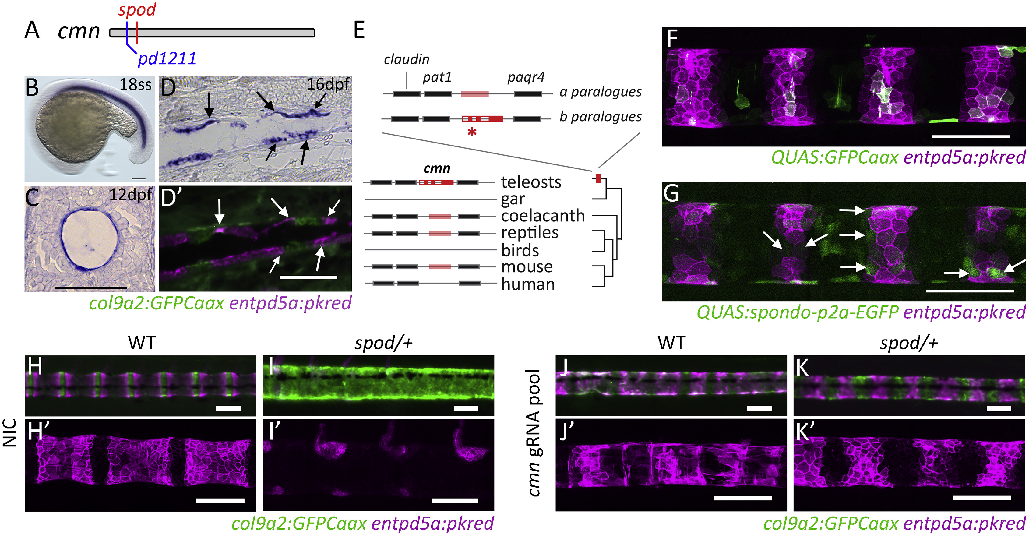 Fig. 3 spondo Is a Dominant, Gain-of-Function Mutation in cmn (A) The spondo mutant phenotype is due to an early, nonsynonymous mutation in the calymmin gene (M10R). pd1211 mutation is a 2 bp deletion upstream of spondo that results in an early stop codon. (B) Expression of cmn during early zebrafish development is confined to the notochord (Figure S3). (C) Cross-section of 12 dpf larvae depicting the restriction of cmn expression to the notochord sheath cells. The spondo mutation causes disruption of the notochordal sheath (Figure S3). (D and D′) At later developmental stages, cmn expression becomes segmented and downregulated in cells that form the chordacentra. The expression is most highly upregulated in the col9a2 domain and in cells that are actively differentiating into mineralizing cells and express both col9a2 and entpd5a (arrows). (E) cmn is a highly derived paralog of an elastin-like extracellular protein. The locus containing cmn is duplicated in zebrafish, retaining synteny with neighboring genes. The gene altered in spondo (asterisk) is highly differentiated from its other paralog (“a”) as well as orthologs found in sarcopterygian lineages and is generally conserved among teleost fishes (Figure S2). (F and G) Overexpression of cmn containing the spondo mutation inhibits sheath cell differentiation into mineralizing cells. DNA constructs containing either QUAS:GFPCaax or QUAS:spod-p2A-EGFP sequences were mosaically overexpressed in a col9a2:QF2 transgenic line. Gaps in entpd5a:pkred expression within mineralizing domains were quantified (arrows). In control conditions, 14.1% of GFP+ sheath cells did not express entpd5a. In the experimental group of fish overexpressing the spondo mutation, 42.2% of GFP+ sheath cells were entpd5a negative. Two tailed p value = 0.0006. Overexpression of wild-type cmn does not have any effect (Figure S4). (H–K′) Reversion of spondo phenotype by creation of disruptive alleles in cis and trans to cmnspondo. Pooled guides targeting cmn injected into wild-type or cmnspod/+ embryos lead to mosaic deletions within the cmn locus. Targeting deletions to cmn reverted the spondo phenotype and partially restored notochord segmentation in 11/11 cmnspod/+ fish analyzed. Phenotype of injected fish closely resembles individuals containing the loss of function allele, pd1211 (Figure S5). See also Table S1.