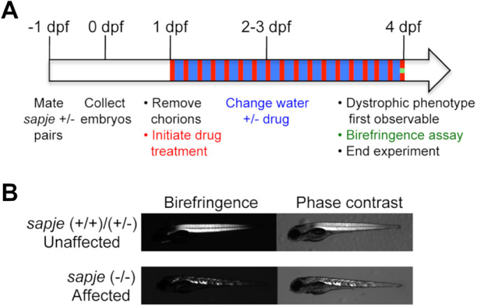 Experimental design of the short-term zebrafish birefringence assay. (A) Heterozygous sapje or sapje-like pairs were mated and their respective embryos were collected and pooled. Drug treatment was initiated on 1 dpf and continued through 4 dpf when birefringence was analyzed. (B) Representative images of the patchy muscle birefringence pattern characteristic of sapje and sapje-like homozygous mutants compared to the highly organized sarcomere structure of (+/+) and (+/−) siblings. Given that the sapje and sapje-like dystrophin mutations are recessive, 25% of untreated offspring are expected to exhibit the affected muscle phenotype.