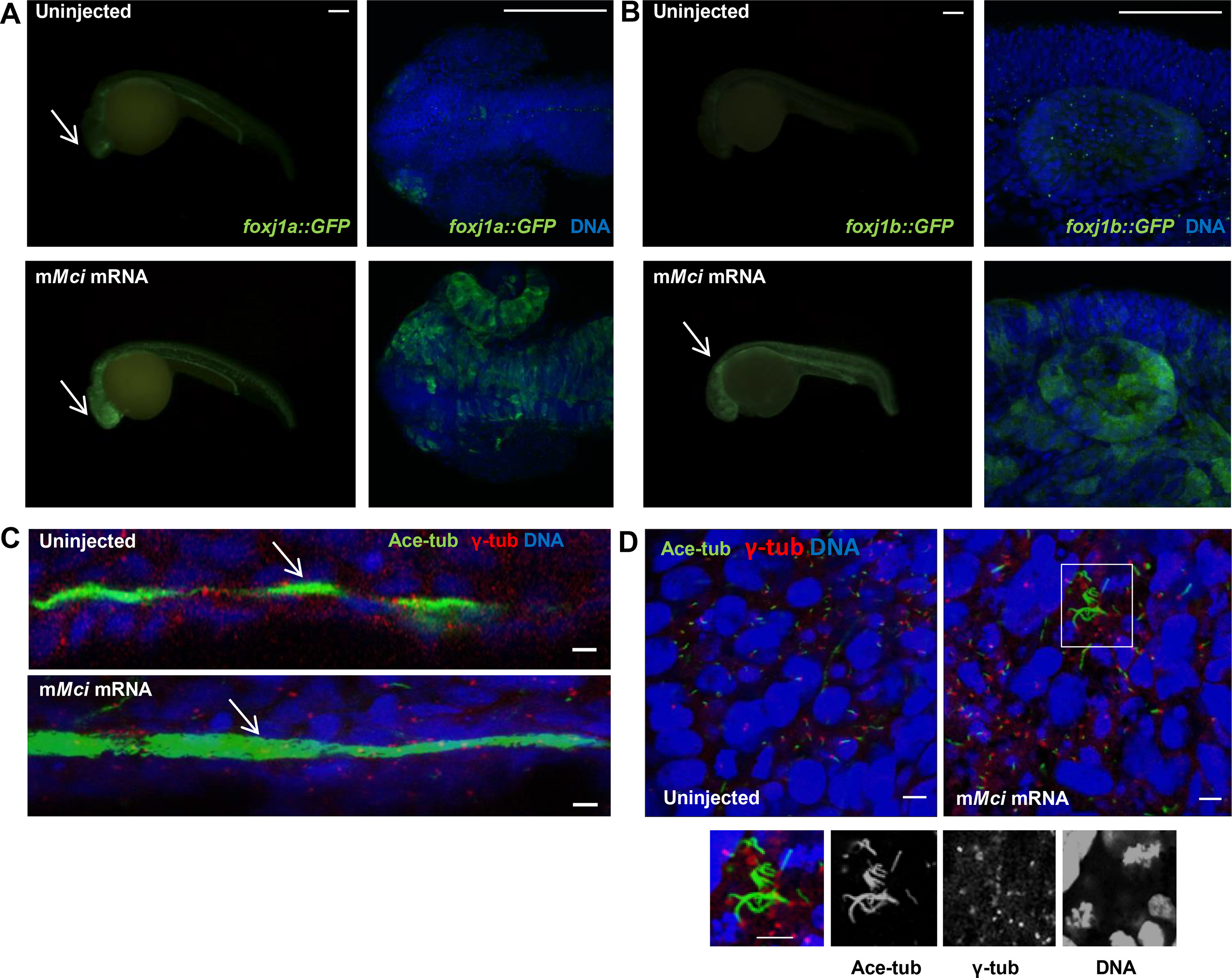 Fig. 1 Overexpression of mouse Mci in zebrafish embryos triggers ectopic foxj1 expression and formation of ectopic MCCs. (A, B) foxj1a (A) and foxj1b (B) expression in 24 hpf zebrafish embryos, as detected by the anti-GFP antibody staining for GFP, were elevated and expanded in mouse Mci (mMci) mRNA-injected foxj1a::GFP (A) and foxj1b::GFP (B) transgenic reporter fish lines, compared to uninjected controls. Ectopic foxj1a expression was detected in the head (arrow) of the majority (90%, n = 20) of Mci-injected foxj1a::GFP fish (A, with magnified dorsal views of the heads in the panels on the right). In the majority (65%, n = 14) of Mci-injected foxj1b::GFP embryos (B), ectopic foxj1b expression was detected in various tissues, including the otic vesicle (arrow, with magnified lateral views of the otic vesicles in the panels on the right). Scale bars = 100 μm. (C, D) Ectopic multiciliation caused by mMci mRNA overexpression in the zebrafish embryo. (C) Density of multicilia bundles in the pronephric ducts increased in mMci mRNA injected embryos compared to uninjected controls (62.5%, n = 16) from two independent experiments. (D) Ectopic multiciliation in the eye in mMci mRNA injected embryos compared to uninjected controls (50%, n = 16 from two independent experiments). Scale bars = 5 μm. For this and all other figures Ace-tub = anti-acetylated tubulin (labeling cilia), γ-tub = anti-γ-tubulin (labeling basal bodies), DNA = DAPI (labeling nuclei).