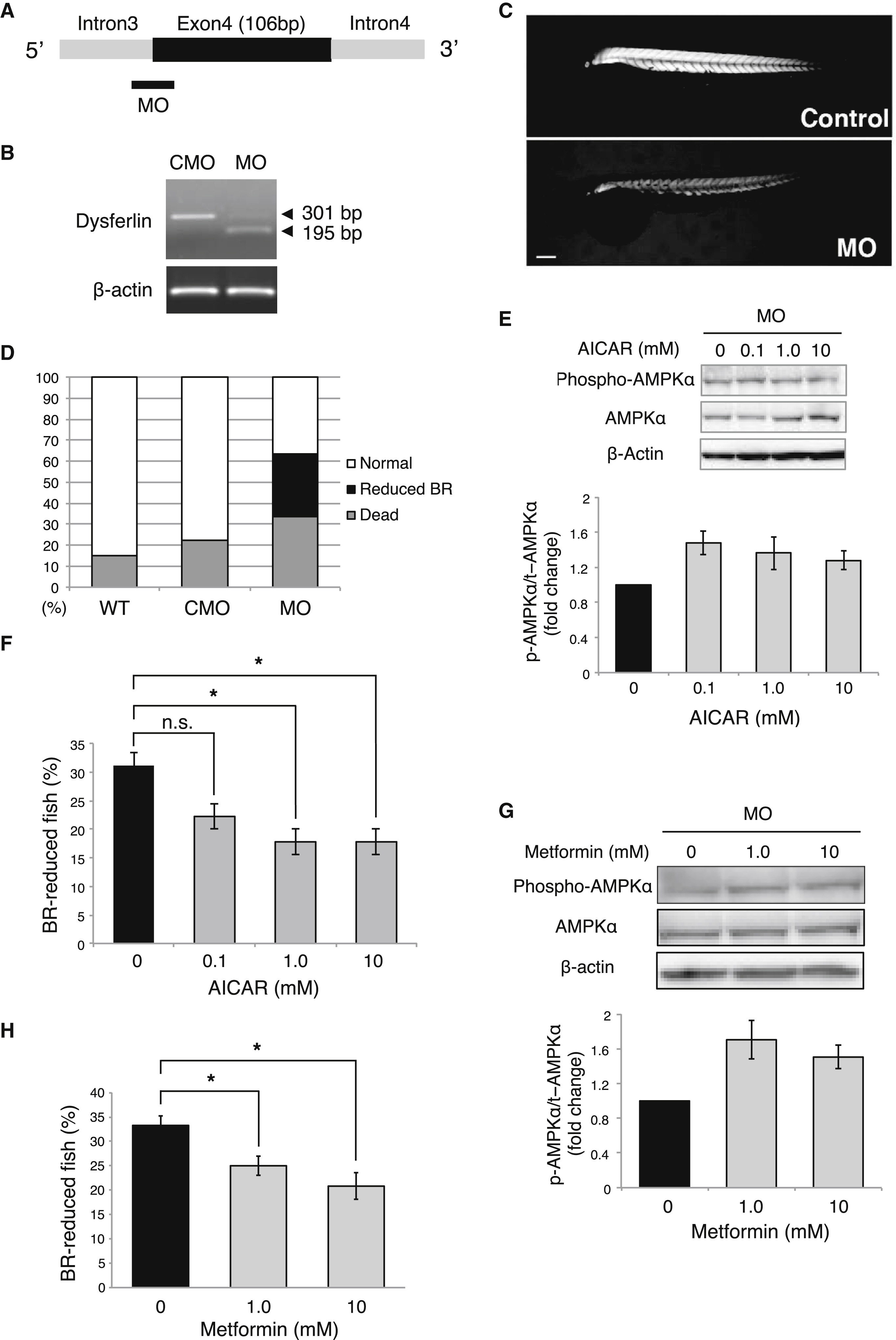 (A) Morpholino oligonucleotides (MOs) targeting zebrafish dysferlin. (B) A single RT-PCR product of 301 bp was seen in 4-dpf embryos injected with 1.5 ng of control MO; two differently sized RT-PCR products of 301 and 195 bp were seen in 4-dpf embryos injected with 1.5 ng of dysferlin. (C) Panels represent the results of the birefringence assay (BR). The abnormal structure of the muscles is more clearly seen in dysferlin MO-injected fish (MO, lower panel) than in controls (CMO, upper panel) under BR. Scale bar, 200 μm. (D) Histogram of the percentage of normal, affected (reduced BR), and dead fish upon MO injection. After injecting 1.5 ng of MO, approximately 30.0% of the embryos exhibited reduced birefringence. The white, black, and gray bars show the percentage of normal, reduced BR, and dead fish, respectively. WT, uninjected fish; CMO, CMO-injected fish; MO, MO-injected fish. (E) Representative western blot image of phospho-AMPK, AMPKα, and β-actin in MO-injected fish treated with AICAR for 4 days at 0, 0.1, 1.0, or 10 mM. Quantification of phospho-AMPK expression was normalized to AMPKα in the lower panels. (F) AICAR treatment reduced the percentage of BR-reduced fish. Results for metformin concentrations of 0, 0.1, 1.0, and 10 mM are the average of three independent experiments. Of the untreated MO morphants, 31.1% were BR reduced. AICAR treatment at concentrations of 0.1, 1.0, and 10 mM reduced the percentage of BR-reduced fish to 22.2%, 17.8%, and 17.8%, respectively. Statistically significant differences were determined using ANOVA followed by Tukey’s multiple comparisons test. Statistical significance was set at *p < 0.05. (G) Representative western blot image of phospho-AMPK, AMPKα, and β-actin in MO-injected fish treated with metformin for 4 days at 0, 1, and 10 mM. Quantification of phospho-AMPK expression was normalized to AMPKα in the lower panels. Results for metformin concentrations of 0, 1, and 10 mM are the average of three independent experiments and were normalized to those without metformin treatment. (H) Metformin treatment reduced the percentage of BR-reduced fish. Results for metformin concentrations of 0, 1, and 10 mM are the average of three independent experiments. Of the untreated MO morphants, 33.3% were BR-reduced fish. Metformin treatment at concentrations of 1 and 10 mM reduced the percentage of BR-reduced fish to 25.0% and 20.8%, respectively. Statistically significant differences were determined using ANOVA followed by Tukey’s multiple comparisons test. Statistical significance was set at *p < 0.05.