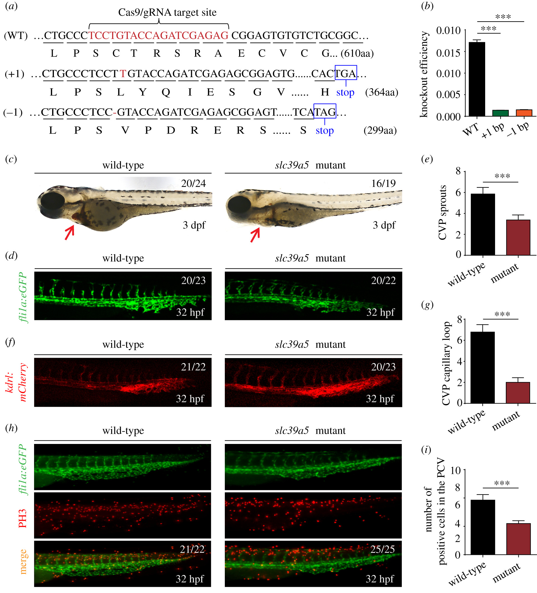 Fig. 4 Targeting strategy and characterization of slc39a5 knockout zebrafish. (a) DNA and corresponding amino acid sequences of the wild-type (WT) slc39a5 allele and the slc39a5 allele after inserting one nucleotide (+1) or deleting one nucleotide (−1) using CRISPR/Cas9-based editing. Both the insertion and the deletion introduce a premature stop codon. (b) Summary of slc39a5 mRNA measured using qPRC in the WT, +1, and −1 slc39a5 mutant lines (n = 3 sets of 50 pooled embryos/group). (c) Representative images of a wild-type and mutant embryo at 3 dpf. Note the significantly smaller heart with reduced cardiac blood flow in the mutant embryo (arrow). (d–e) Representative images of the CVP in wild-type (left) and mutant (right) Tg(fli1a:eGFP) (d) and summary of CVP sprouting in these embryos (e). (f–g) Representative images of the CVP in wild-type (left) and mutant Tg(kdrl:mCherry) (f) and summary of capillary loops in the CVP (g) in these embryos. (h) Representative images of PH3 immunostaining in the CVP of wild-type and mutant Tg(fli1a:eGFP) embryos. (i) Summary of PH3-positive cells in the CVP of wild-type and mutant Tg(fli1a:eGFP) embryos at 32 hpf. ***p < 0.001.