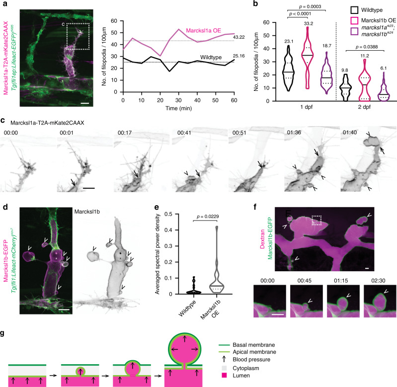 a, b Marcksl1 regulates filopodia formation. Increased expression of Marcksl1a in ECs (magenta) increases filopodia formation when compared to wildtype EC (green) at 31 hpf (a). Dashed box, region of vessel measured. Quantification of wildtype EC or ECs overexpressing Marcksl1b (Marcksl1b OE) or depleted of marcksl1a and marcksl1b at 1 and 2 dpf (b, 1 dpf: wildtype, n = 87 ISVs/ 29 embryos; Marcksl1b OE, n = 32 ISVs/19 embryos; marcksl1ark23;marcksl1brk24, n = 67 ISVs/16 embryos. 2 dpf: wildtype, n = 29 ISVs/10 embryos; Marcksl1b OE, n = 18 ISVs/15 embryos; marcksl1ark23;marcksl1brk24, n = 126 ISVs/28 embryos). Statistical significance was assessed by ordinary one-way ANOVA with Sidak’s multiple comparisons test. Mean values are indicated. c Overexpression of Marcksl1a in ECs causes ectopic membrane blebbing during lumen expansion. Apical membrane (arrow) of an endothelial tip cell expands until the leading edge of the tip cell, at which point ectopic basal blebs (arrowhead) protrude into the surrounding tissue. Movies were taken from 31 hpf. d Overexpressing of Marcksl1b in EC (magenta) induces ectopic basal blebs (arrowhead) in the ISV of 54 hpf embryo. e Quantification of membrane blebbing shows a significant increase in blebbing in ECs with increased expression of Marcksl1b when compared to wildtype EC of ISVs in 2 dpf Tg(kdr-l:ras-mCherry)s916 embryos (wildtype, n = 21 cells; Marcksl1b OE, n = 20 cells). Statistical significance was assessed by two-tailed unpaired t test with Welch’s correction. f, g Marcksl1-induced blebs are comprised of apical and basal membranes (green). Newly formed basal blebs (arrowhead) are filled with Dextran (magenta). 00:00; minutes:seconds. Dashed box in f, a magnified region. Violin plots in b, e represent the entire range of values, dotted lines indicate first and third quartiles, center lines are median. Scale bars, 5 µm (f) and 10 µm (a, c, d). Source data are provided as a Source data file.