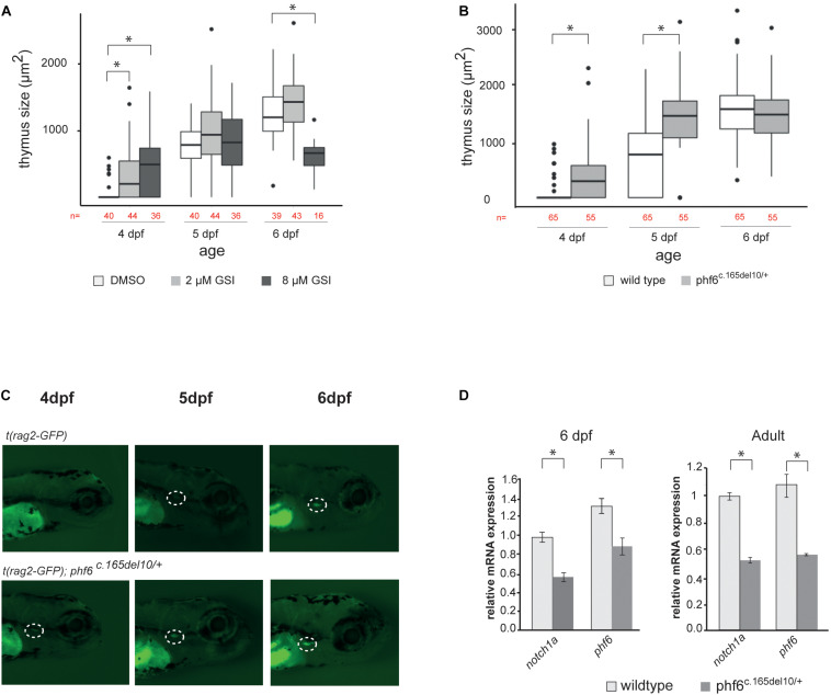 phf6 downregulation accelerates T cell development in vivo. (A) Box plot showing thymus size (μm2) at 4, 5, and 6 days post-fertilization (dpf) based on GFP signal of wild type (AB) fish treated with 2 or 8 μM of gamma-secretase inhibitor (GSI) or DSMO as control treatment. Details on these results are provided in Supplementary Table 2 and statistical analysis is shown in Supplementary Table 3, ∗P < 0.05 (Wilcoxon rank sum test). (B) Boxplot showing thymus size (μm2) of wild type (AB) and phf6c.165del10/+ heterozygous embryos from 4 until 6 dpf based on rag2-GFP signal quantification. ∗P < 0.05 (Wilcoxon rank sum test, Supplementary Table 4). (C) Representative image of thymus visualization used for quantification of data as shown in panel (A). Original magnification X30. Circle with white dashed line indicates emerging thymus. (D) Average normalized notch1a and phf6 expression in sorted T cells of 4 replicates of 100 pooled wild type (AB) and phf6c.165del10/ + embryo’s on 6dp (left) and of 3 replicates of 6 pooled wildtype and 6 pooled phf6c.165del10/ + adult zebrafish (right). Error bars indicate SEM, ∗P < 0.05 (unpaired T-test).