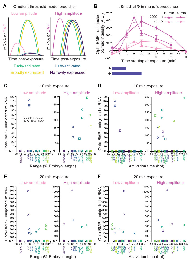 Figure 6 (A) The activation threshold model predicts that broadly expressed genes will be activated by lower amplitude signaling. (B) pSmad1/5/9 immunofluorescence in uninjected and Opto-BMP-injected embryos exposed to 10 (triangle, dashed line) or 20 (diamond, solid line) min of 70 (light pink) or 3900 (magenta) lux blue light starting at shield stage. Immunofluorescence was quantified and plotted as Opto-BMP signal - uninjected with piecewise linear interpolation between timepoints; error bars represent standard error (see Materials and methods for statistical analysis). Embryos for the transcriptional response experiment were collected 30 (x), 40 (square), or 50 (circle) min after the start of light exposure. (C-F) Transcriptional responses in Opto-BMP embryos exposed to conditions shown in (B) were quantified using NanoString technology and are plotted against spatial range (C,E) or activation time (D,F). Embryos were collected 30 (x), 40 (square), or 50 (circle) min after the start of light exposure. Responses that are not statistically significant are anchored to the x-axis (N.S.; see Materials and methods for statistical analysis). See the Figure 6—source data 1 file for source data.